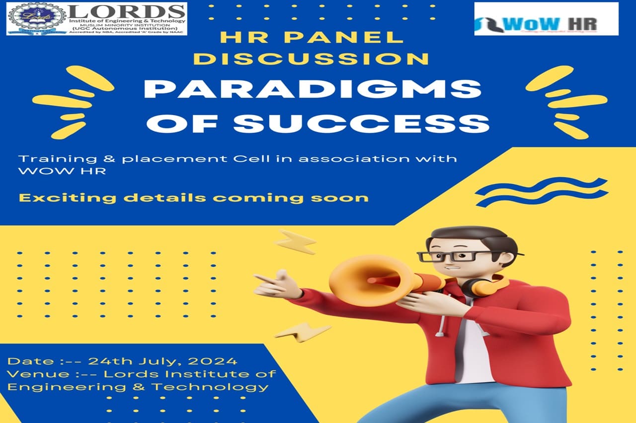 Description: On July 24, 2024, HR Panel discussion on PARADIGMS OF SUCCESS was arranged by the Training and Placement Cell. Five experts and about 450 students attended the event. Students gained knowledge on how to deal with rejections, interviews, failures, and success, to name just a few. Students had all of their questions about the interview procedure, the necessary skill set, and how to approach interviews answered in one-on-one sessions.