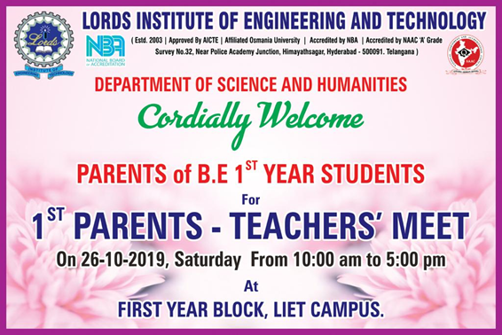 Events Parent-Teacher Meet B.E.1st Year 1st Semester admin October 26, 2019 Title: Parent-Teacher Meet B.E.1st Year 1st Semester Date: 26th October 2019 Department: Science & Humanities(First Year) No. of students attended: ← Inauguration of Student Counseling Room One day Workshop on “Cloud Computing” →