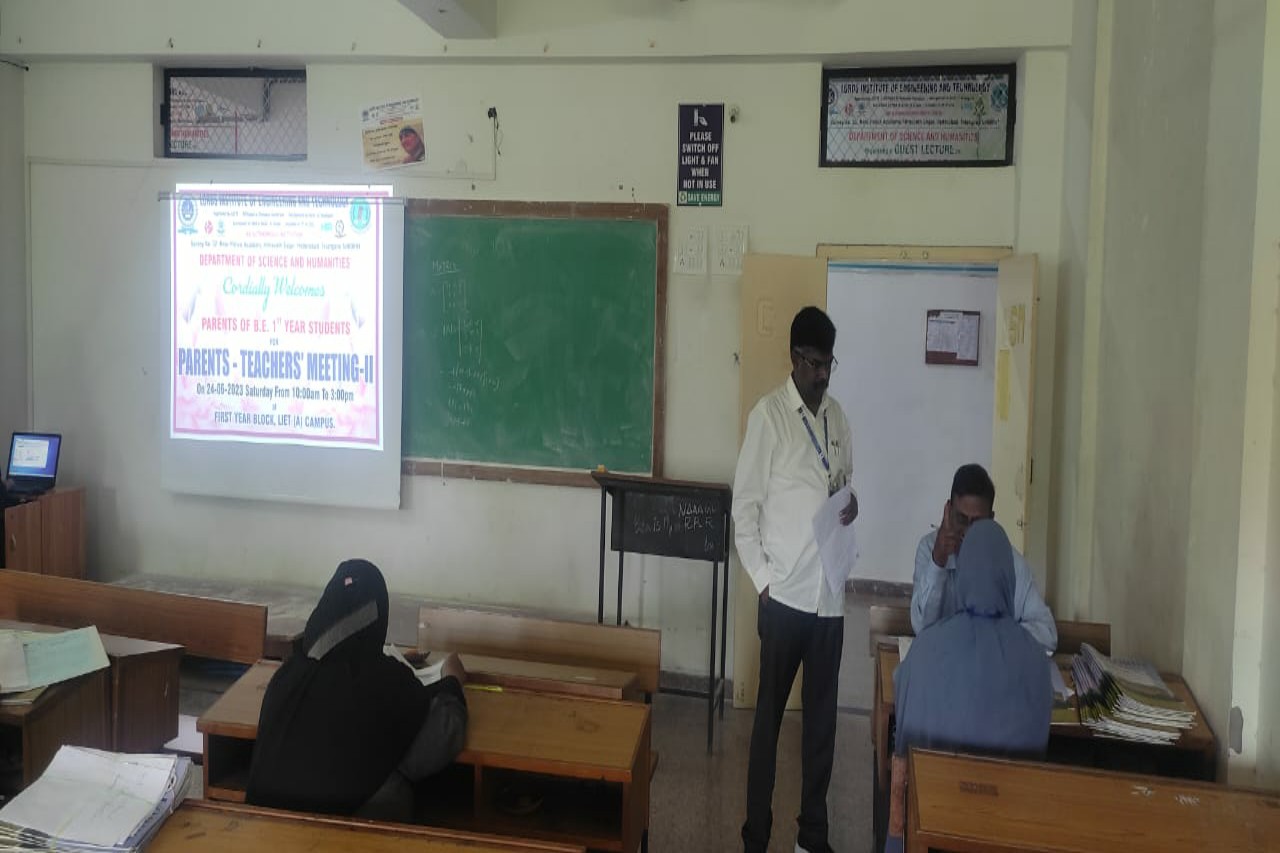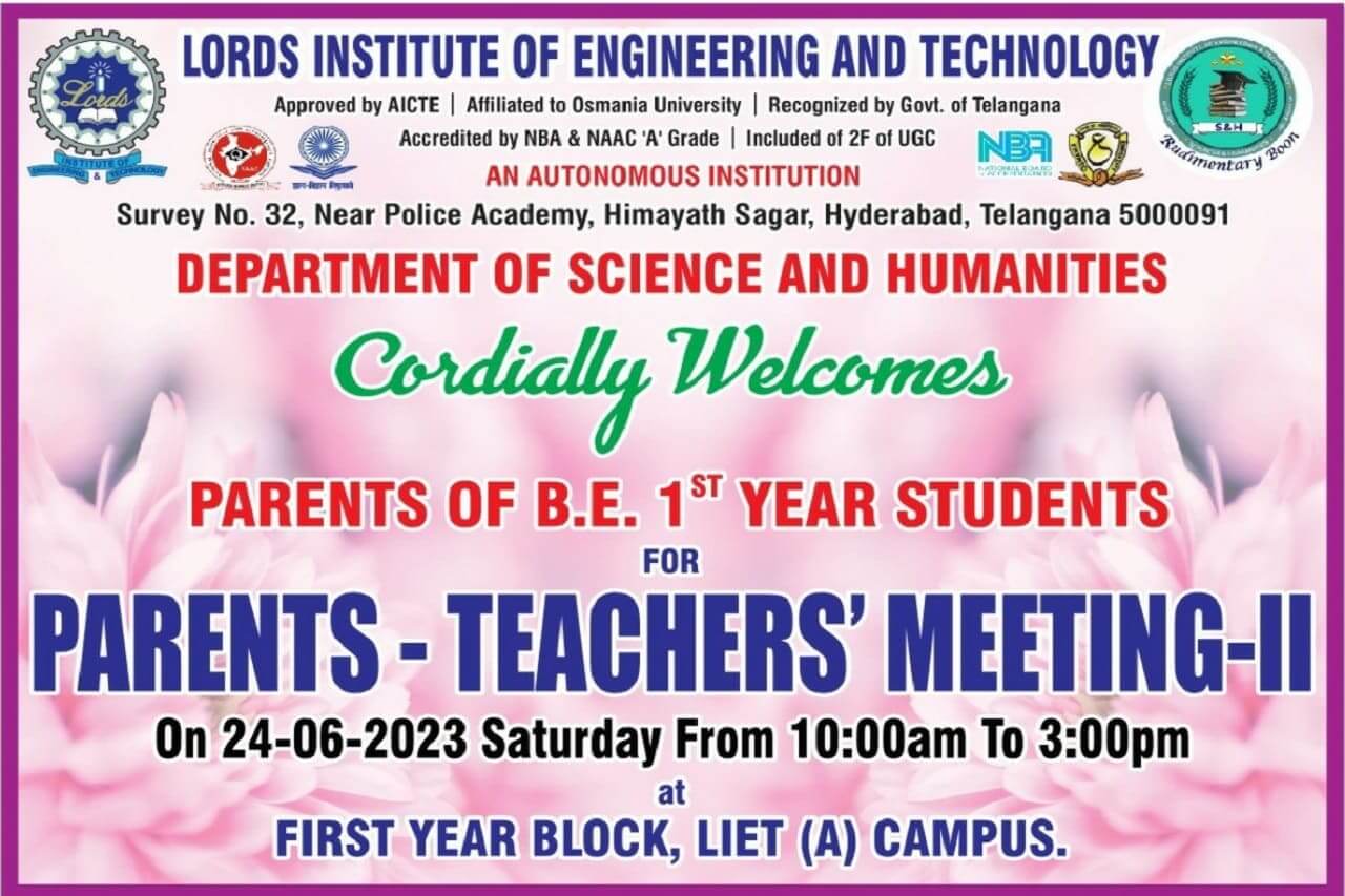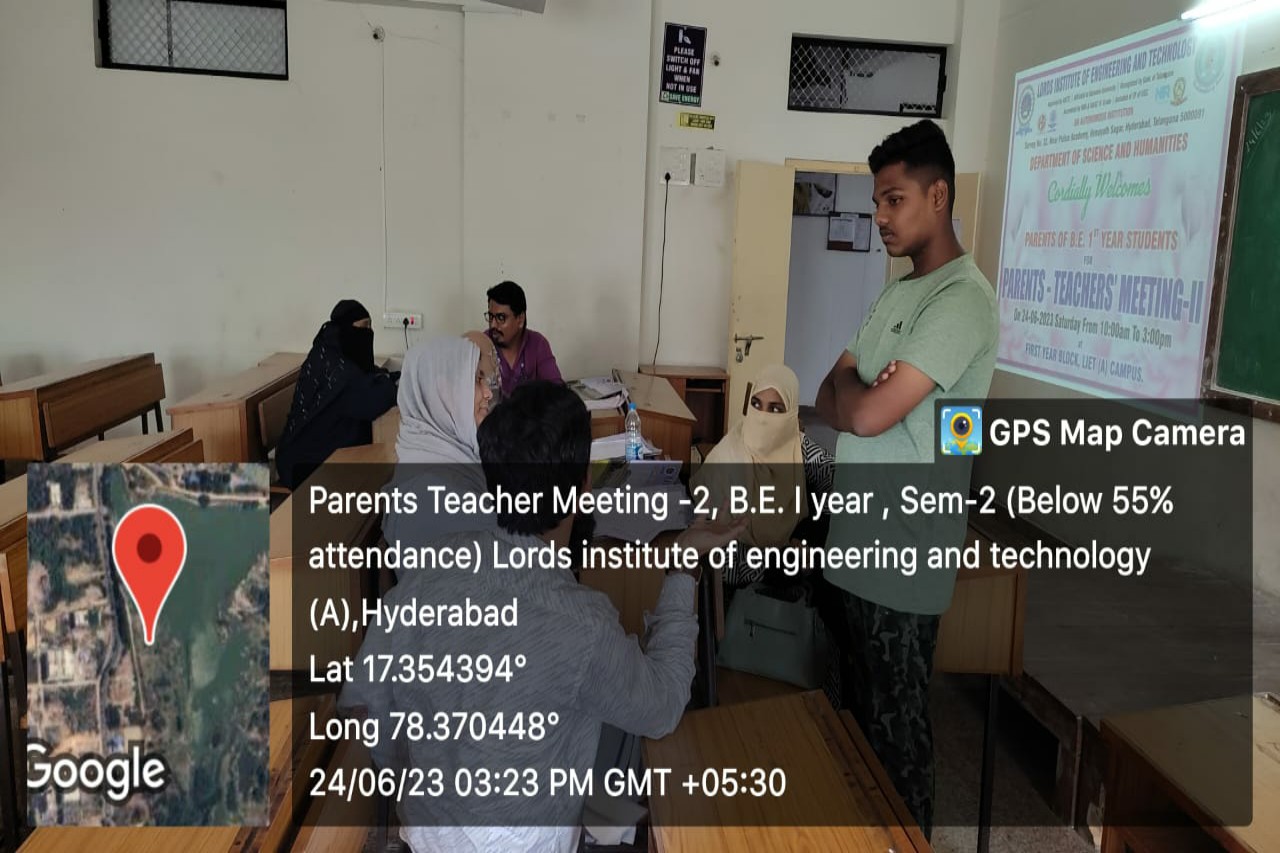 Lords Institute of Engineering & Technology (Autonomous), the Department of Science& Humanities has conducted their Parents-Teachers’ meeting in offline mode for B.E-I Year SEM-II on 24th June 2023 at First Year Block from 10.00 am to 4.30pm.The meeting was held to discuss the students’ progress in Academics (SEE-I Results), Attendance (Below 55% in SEM II), Conduct in the college and schedule of forthcoming Examinations (as per ALMANAC) etc.