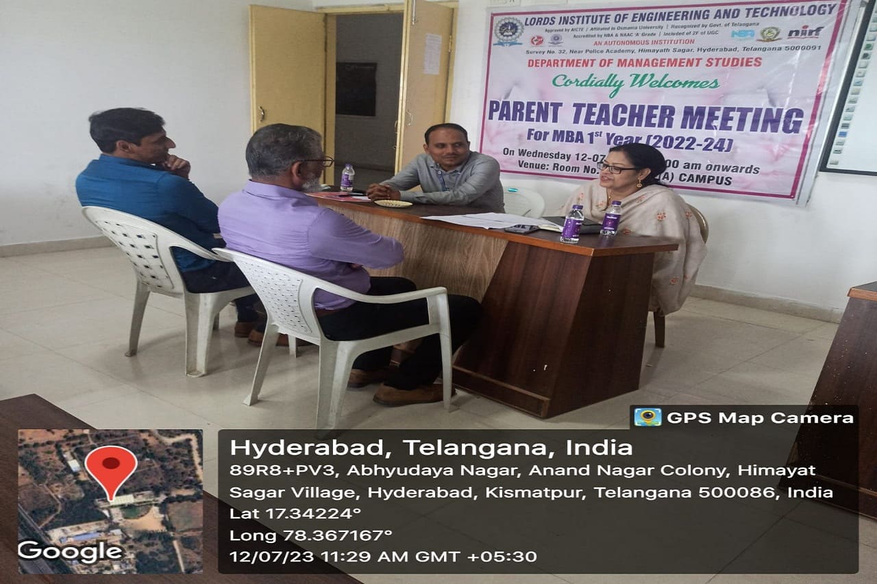 Description about the event (50 Words): First Parent teacher meeting was conducted by MBA department for MBA 1st yr, 2nd semester students on 12th july, 2023 at Smart class no 418 from 10..am to 3.00 pm. This meeting was attended by students along with their parents. Department faculty members interacted with parents and gave their progress report. Parents appreciated this effort of LIET, the MBA department, to interact with parents and update them about students’ progress. They expressed their intention to come back for the next PTM.