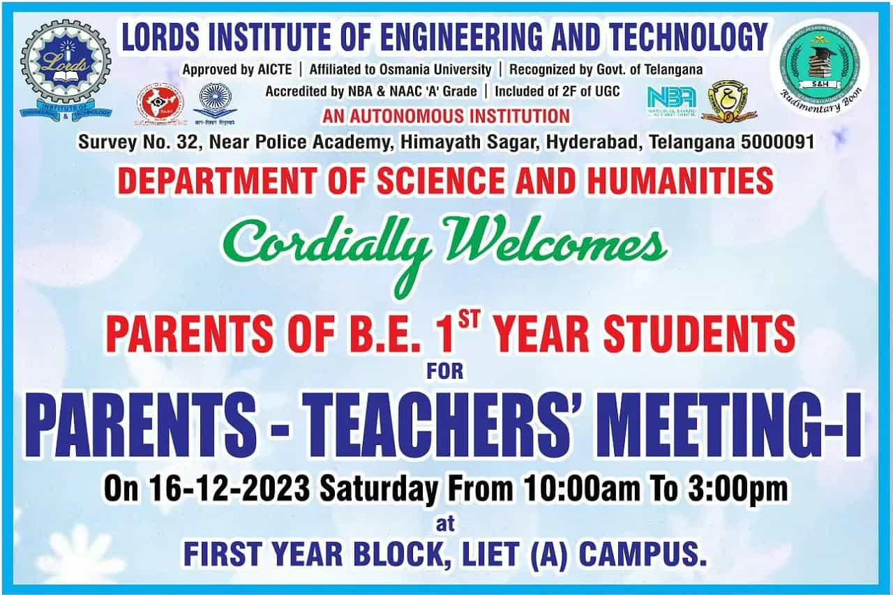 The Science and Humanities Department organized the Parent-Teacher Meeting-I on December 16, 2023, at the First Year Block in the College Campus for B.E. First Year Students. Discussions centered around the students’ Academic Progress, Performance in CIE-1, Attendance Percentage, and Engagement in other Activities. Parents were encouraged to provide Feedback, remarks, and suggestions during the session. Students with consistently low attendance were identified, counseled, and parents were urged to ensure regular attendance for their wards.