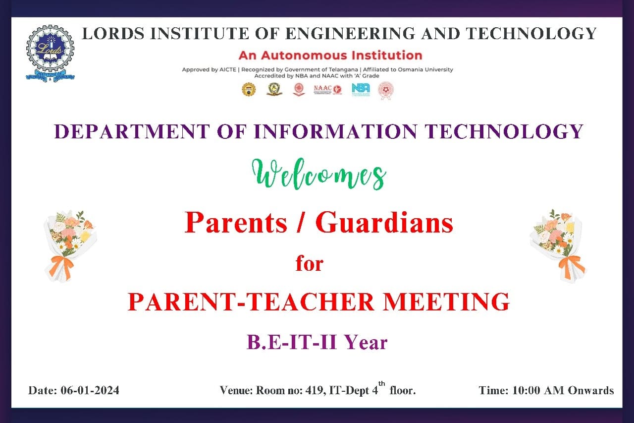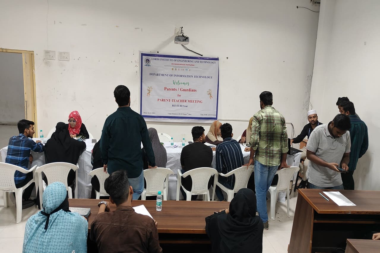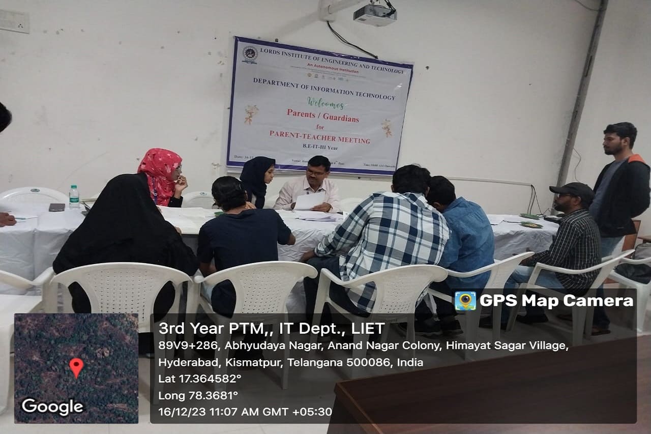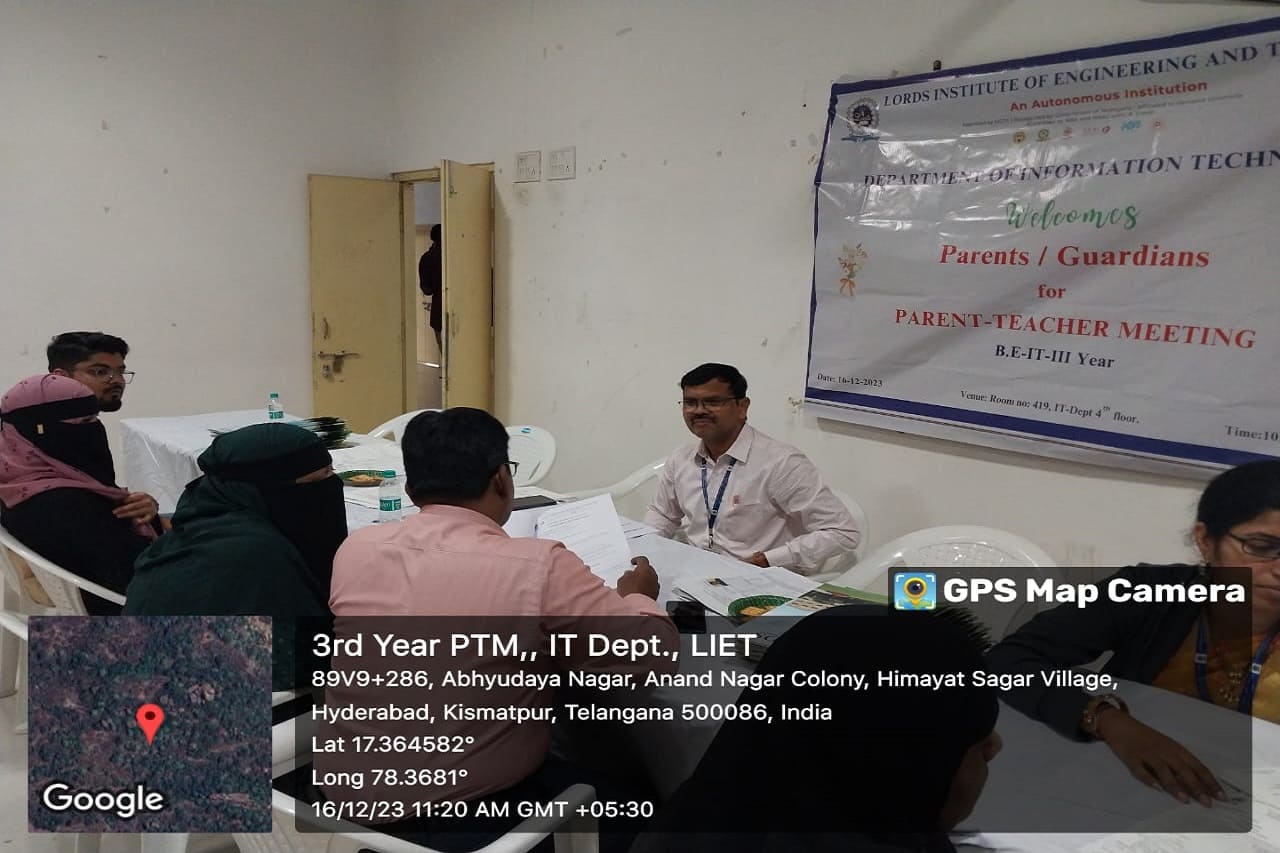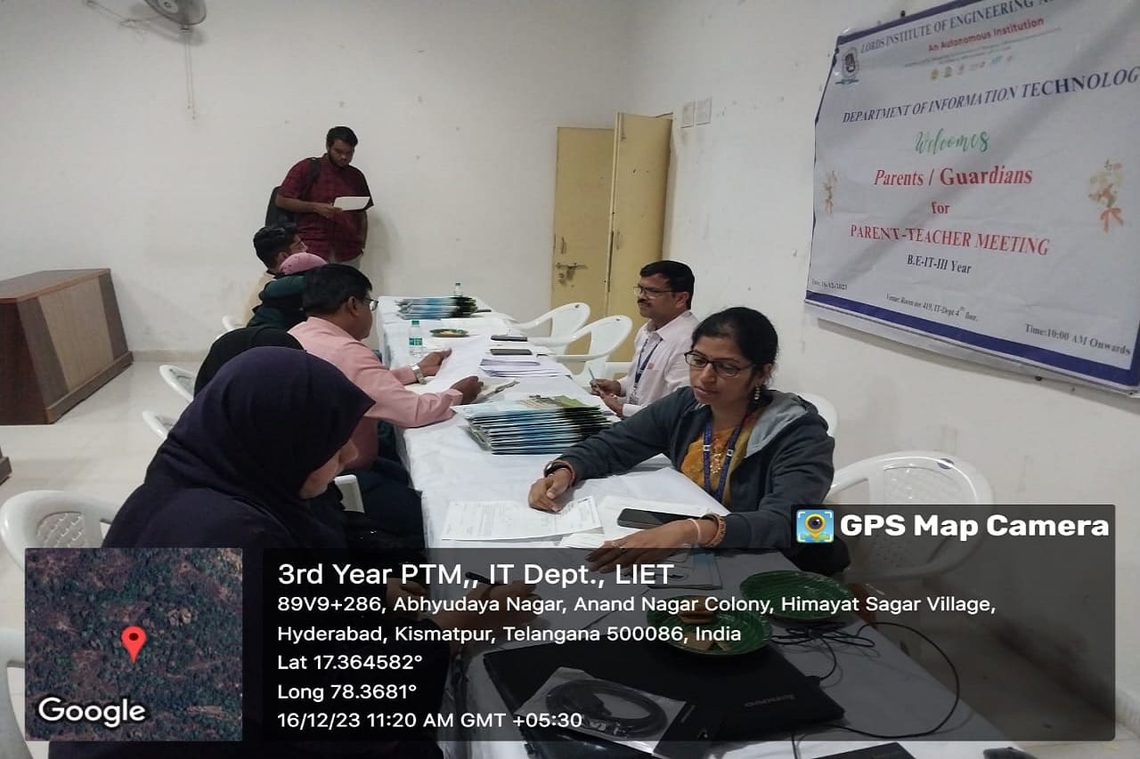 Description: Department of Information Technology has conducted Parent Teacher Meeting on 16-12-2023 & 06-01-2024 at 419 Smart Class-IT, IV Floor, LIET. Dr. K Nagi Reddy HoD-IT, Mentors & Class Incharges Interacted with the parents/Guardian & informed about the Academics & CIE-I Marks, Regularity, Minimum attendance required as per norms, Placement Training Plan, Professional Improvements required in students for their career growth.