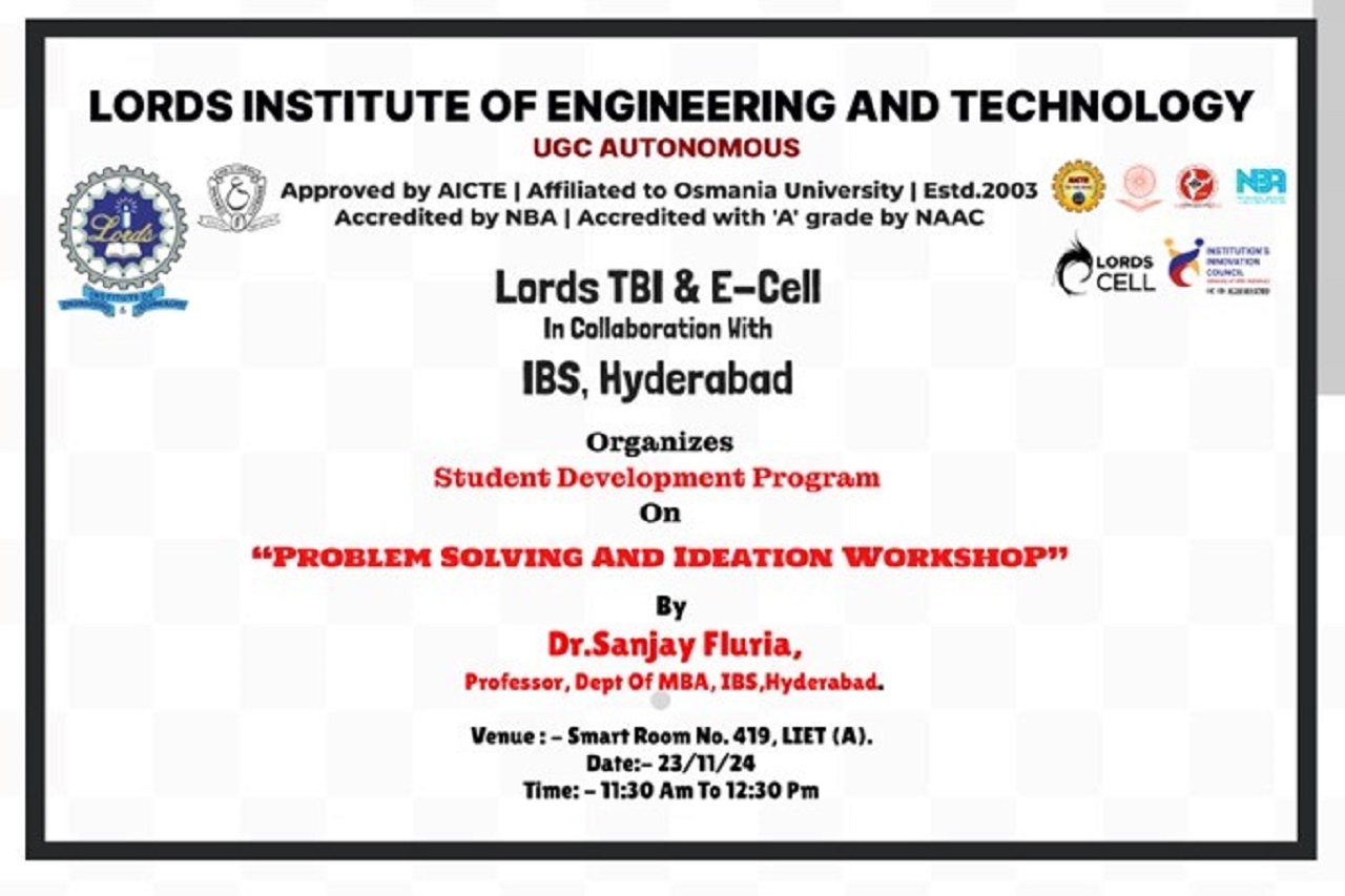 On 23/11/24 a session on “Session on Problem Solving and Ideation Workshop” was organized by the Entrepreneurship Development Cell and IIC. The session was handled by Dr. Sanjay Fluria, Professor at IBS, Hyderabad. Fifty-Five students from IT & CSE department participated in the program. The program was coordinated by Dr. Sumeet Hangargi, Coordinator of IIC, LIET(A) FROM 11:30 AM TO 12:30 PM.