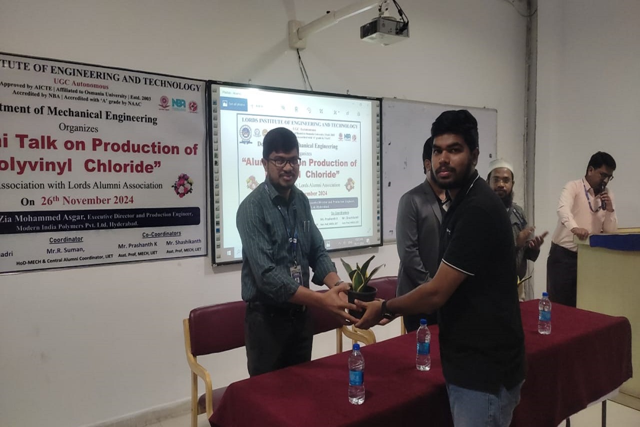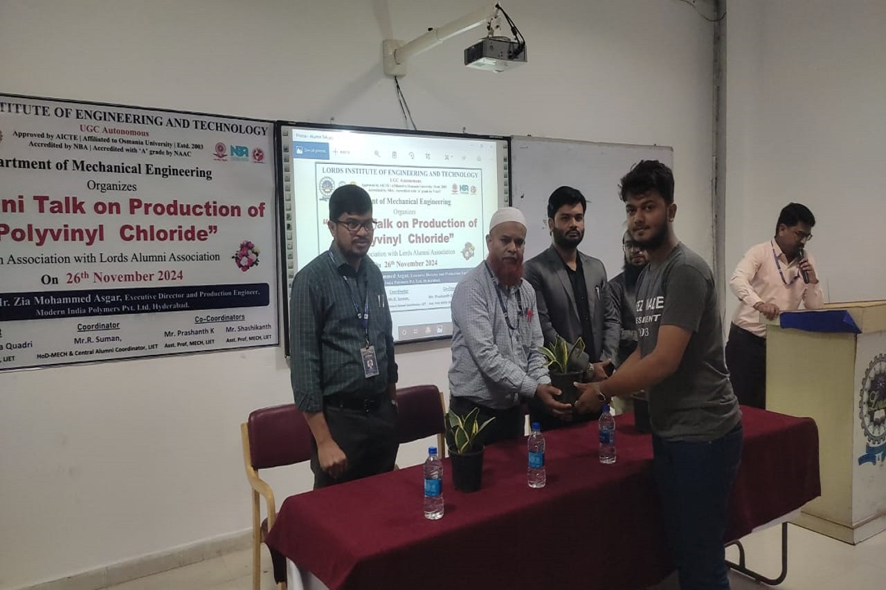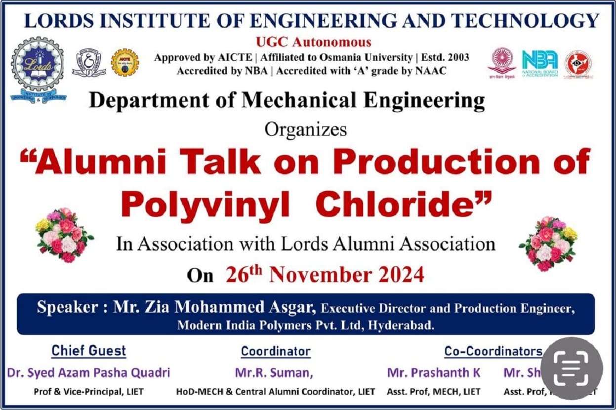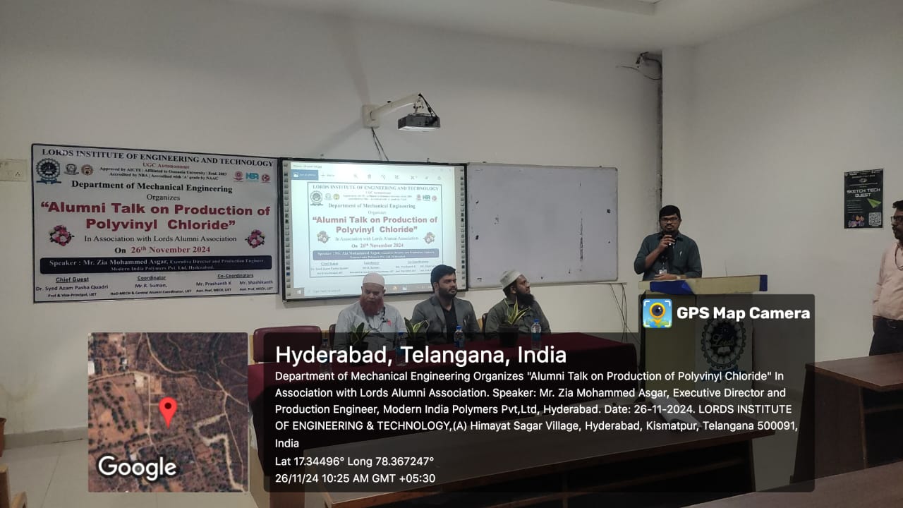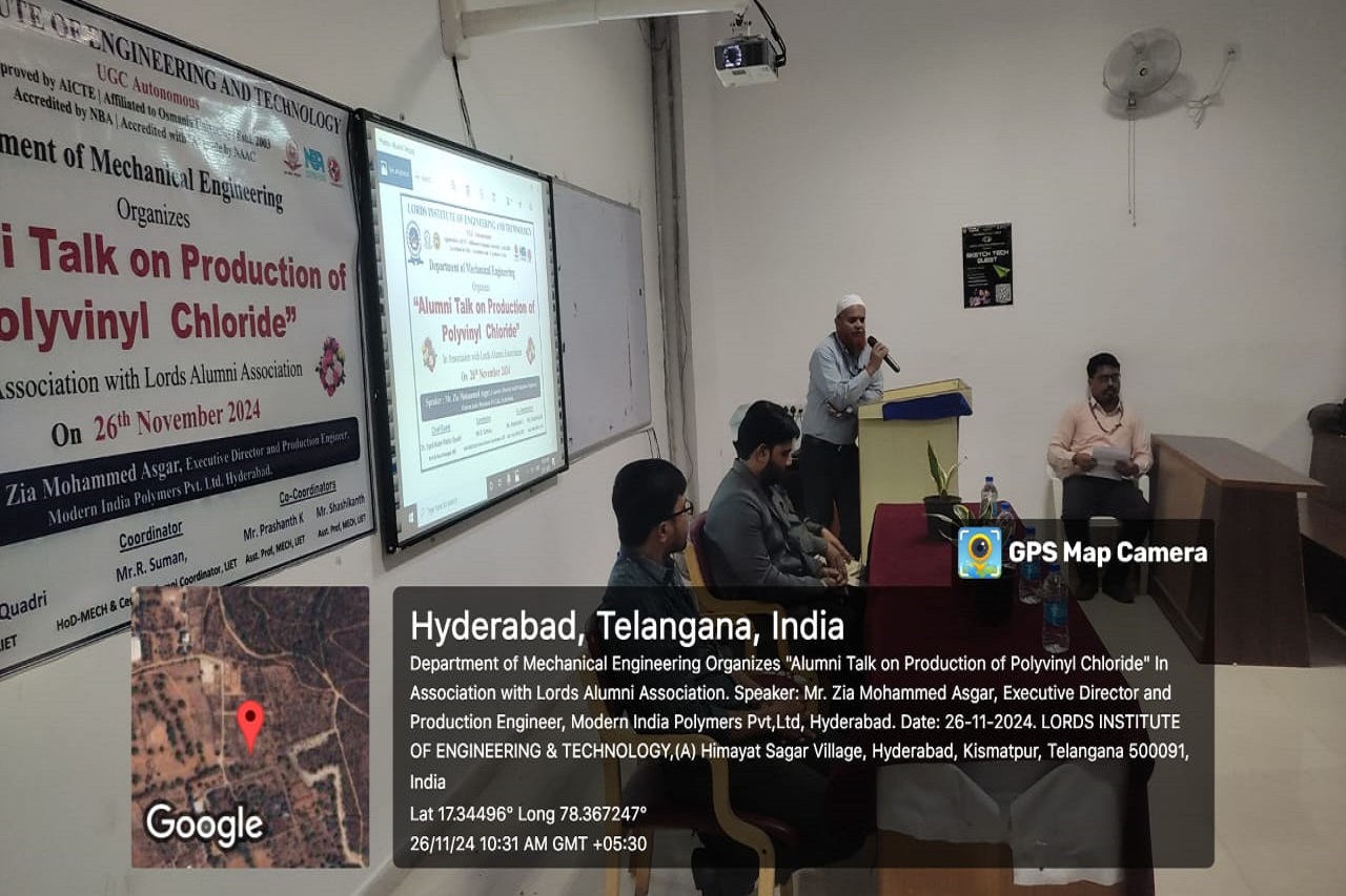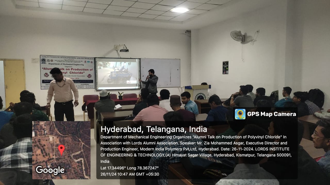 Description: Department of Mechanical Engineering, Lords Institute of Engineering & Technology (A) has organized an event “Alumni Talk on Production of Polyvinyl Chloride” on 26-11-2024 in Association with Lords Alumni Association. A total of 49 students have attended this event.