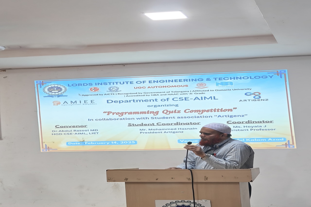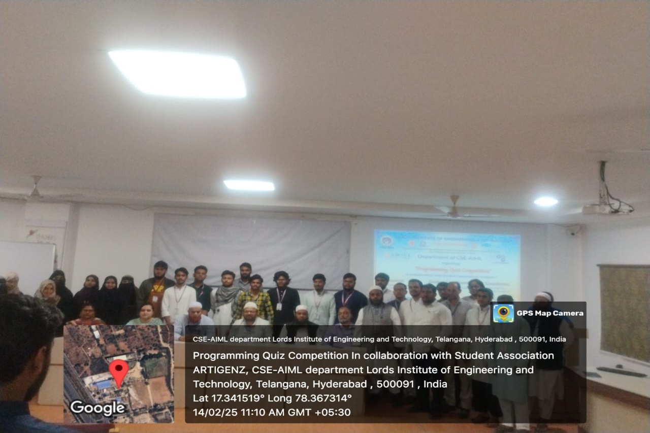 Description: The Department of CSE-AIML , in collaboration with the Students’ Association Artigenz at Lords Institute of ENgineering and Technology(A), conducted a programming quiz competition on February 14th, 2025, with a total participation of 73 students. The event aimed to enhance students’ problem-solving skills and foster a competitive spirit in coding. Prizes were also awarded to the top performers in recognition of their excellence.