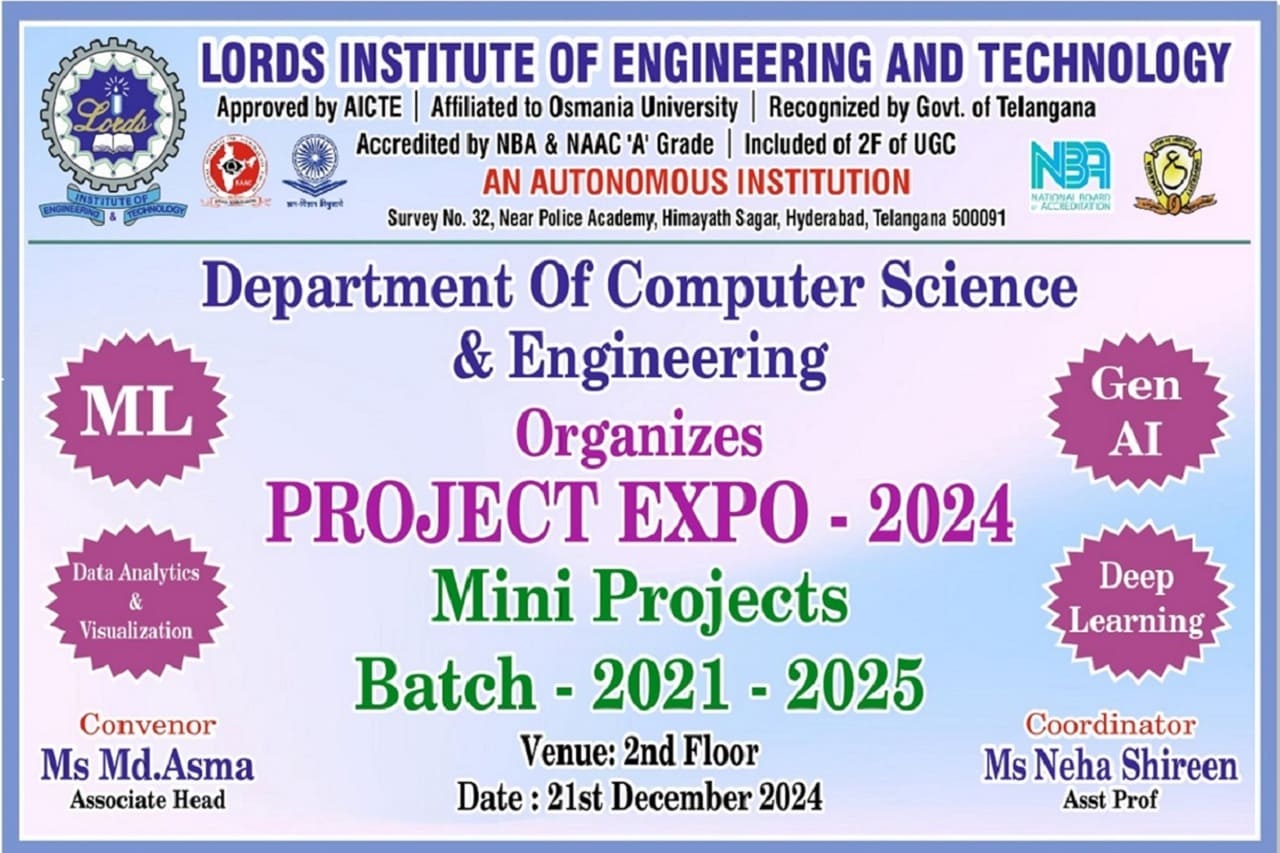 Description about the Event: Department of the CSE has conducted a ” Project Expo-2024 Mini Projects batch 2021-2025 was held on 21-12-2024 , II floor, CSE Department. Dr. Ravi Kishore Singh, Principal- LIET, Dr.Nagi Reddy – Academics Dean, Dr T. k. Shavali -Hod CSE graced the event. Associate Hod -CSE has welcomed all the participants and the guest faculty.