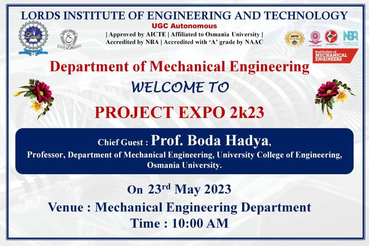 Description: Project Expo-2K23 was conducted by the Department of Mechanical Engineering on 23rd May 2023.Dr. Boda Handya, Professor, Department of Mechanical Engineering, University College of Engineering, OU, Hyd, was the Chief Guest for Project Expo-2K23.Mr. Syed Touseef Ahmed Vice-Chairman of the Lords Institute of Engineering and Technology and Dr. Syed Azam Pasha Quadri, Vice Principal & Professor Department of Mechanical Engineering, LIET Hyd. And Mr. Ramavath Suman Head of the Department was present. All the projects were reviewed by a panel and appreciated by students for excelling in their academic field.