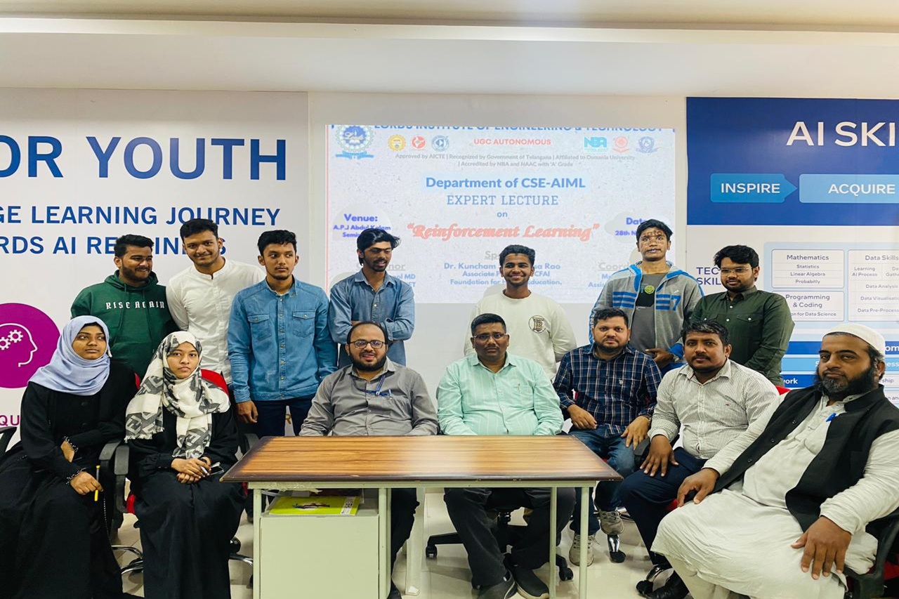Description: The Department of CSE-AIML at Lords Institute of Engineering and Technology(A) conducted an Expert Lecture on Reinforcement Learning on November 28, 2024. The resource person were Dr. Kuncham Sreenivasa Rao Associate Professor, ICFAI Foundation for Higher Education, Hyderabad.A total of 150 students and 10 faculty members attended the session. The event aimed to get Insights on Reinforcement learning to drive deep into the developing technologies which helps in building the future.