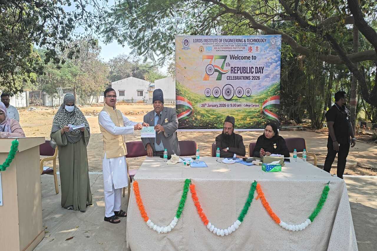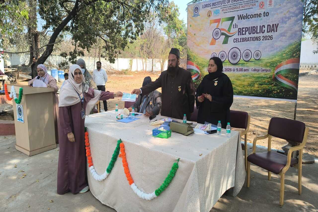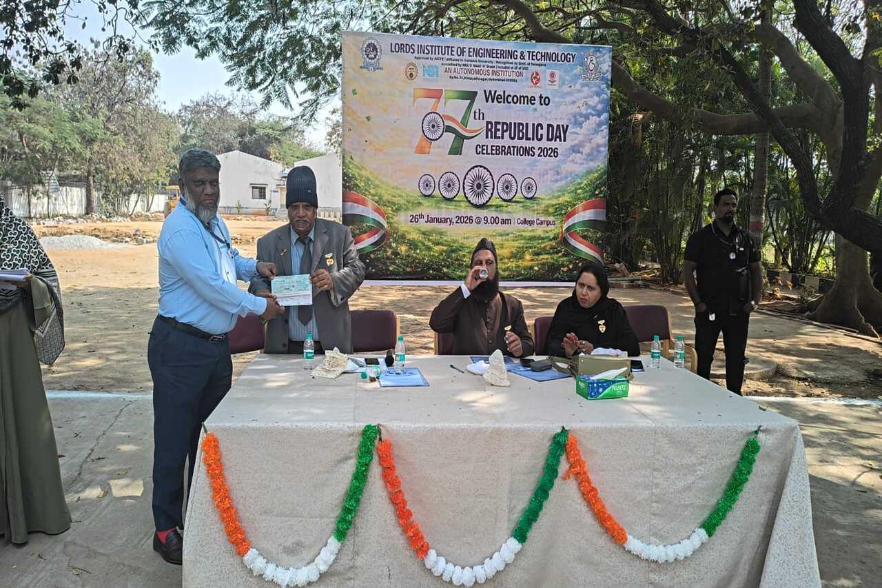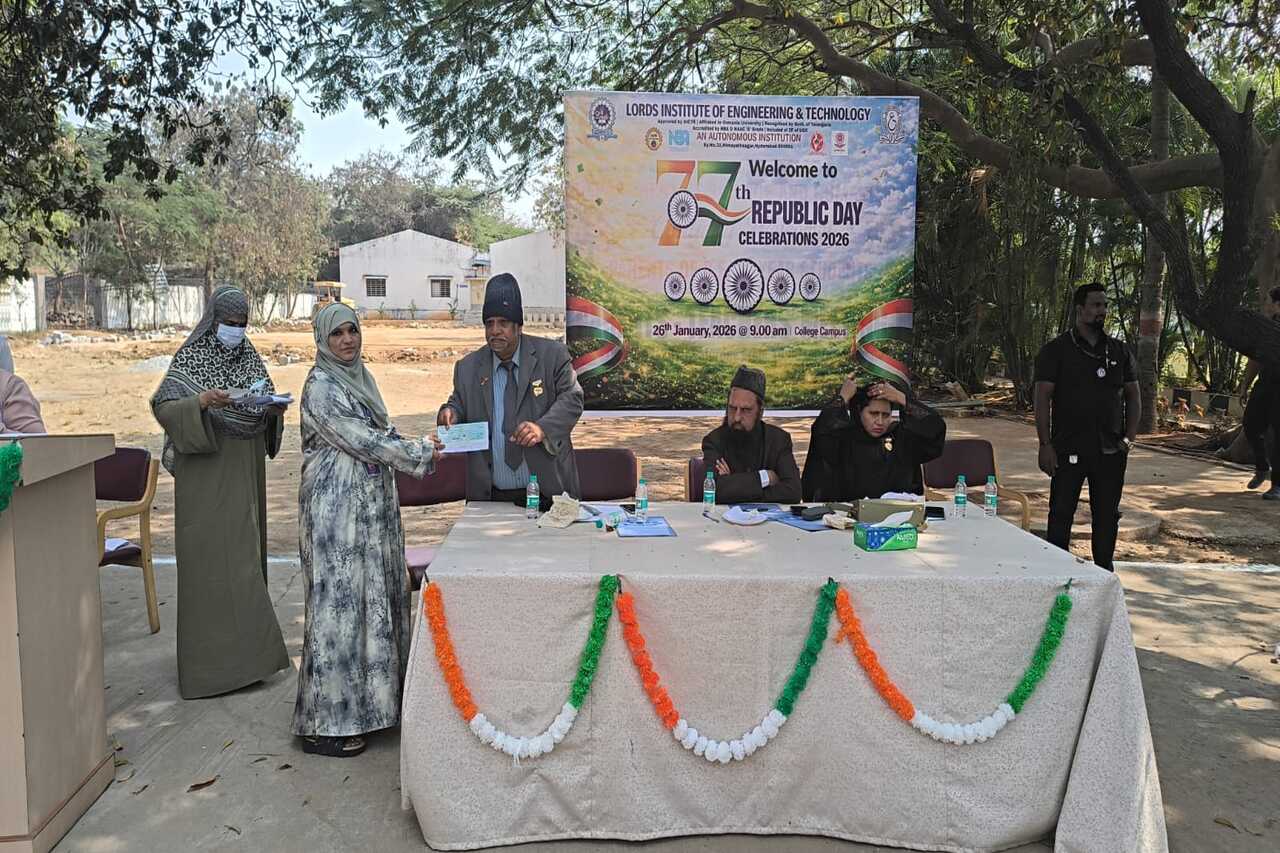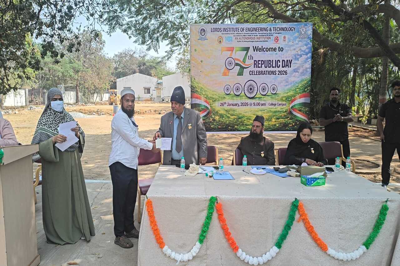 Description: Lords Institute of Engineering and Technology (Autonomous) celebrated the 77th Republic Day on 26th January 2026 from 9:00 AM onwards with great patriotic fervor and enthusiasm. The National Flag was hoisted by the Chairman, Janab C. A. Basha Mohiuddin, marking the beginning of the celebrations. The event fostered a strong sense of patriotism among the faculty, staff, and students. Faculty members were felicitated with appreciation awards and incentives for their research contributions, excellent performance in NPTEL Certification Examinations, and were also provided financial support for obtaining professional memberships.