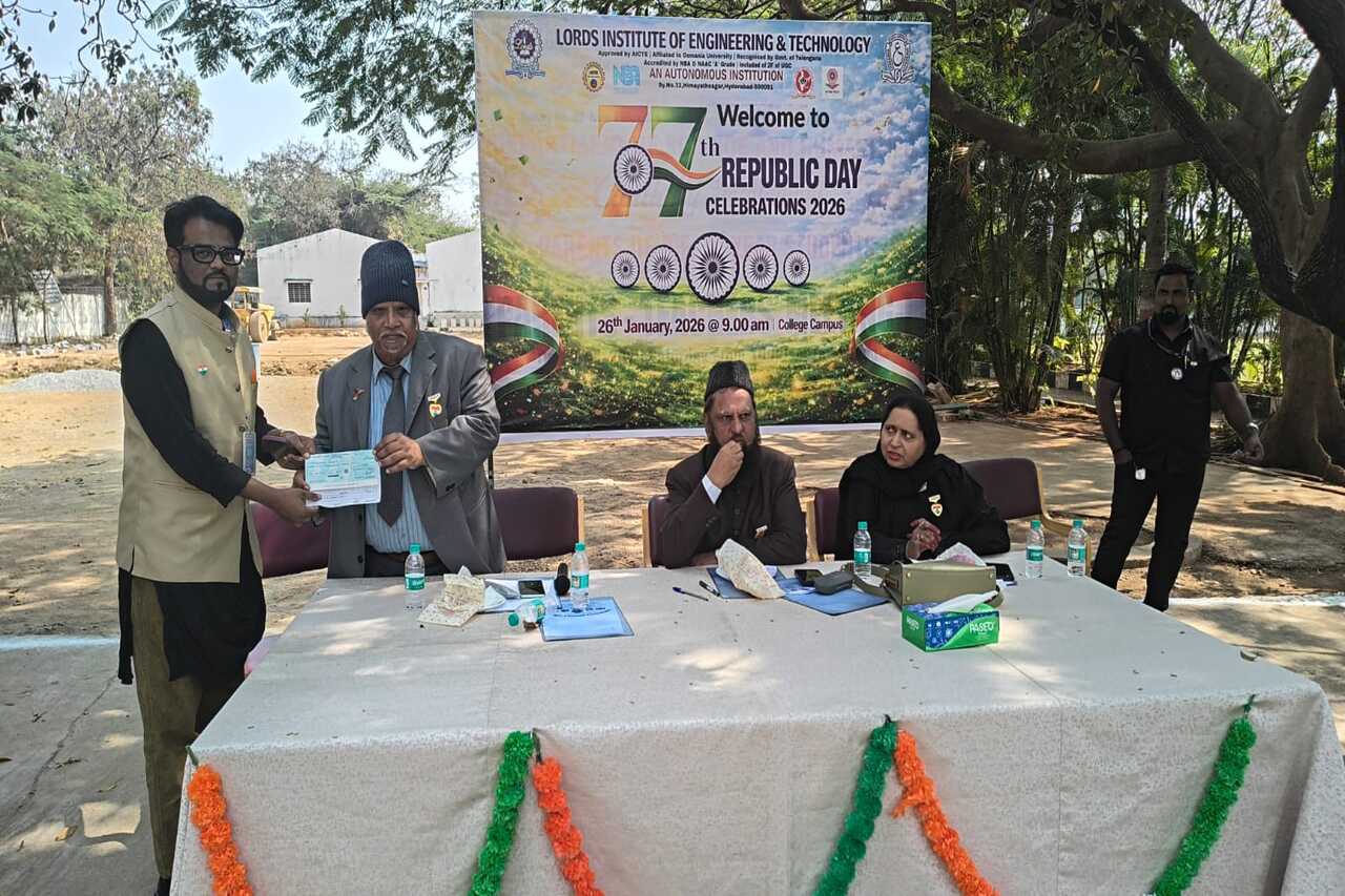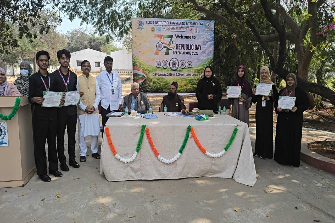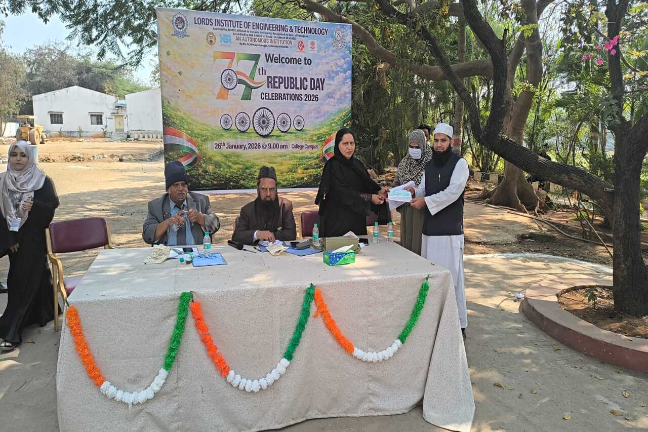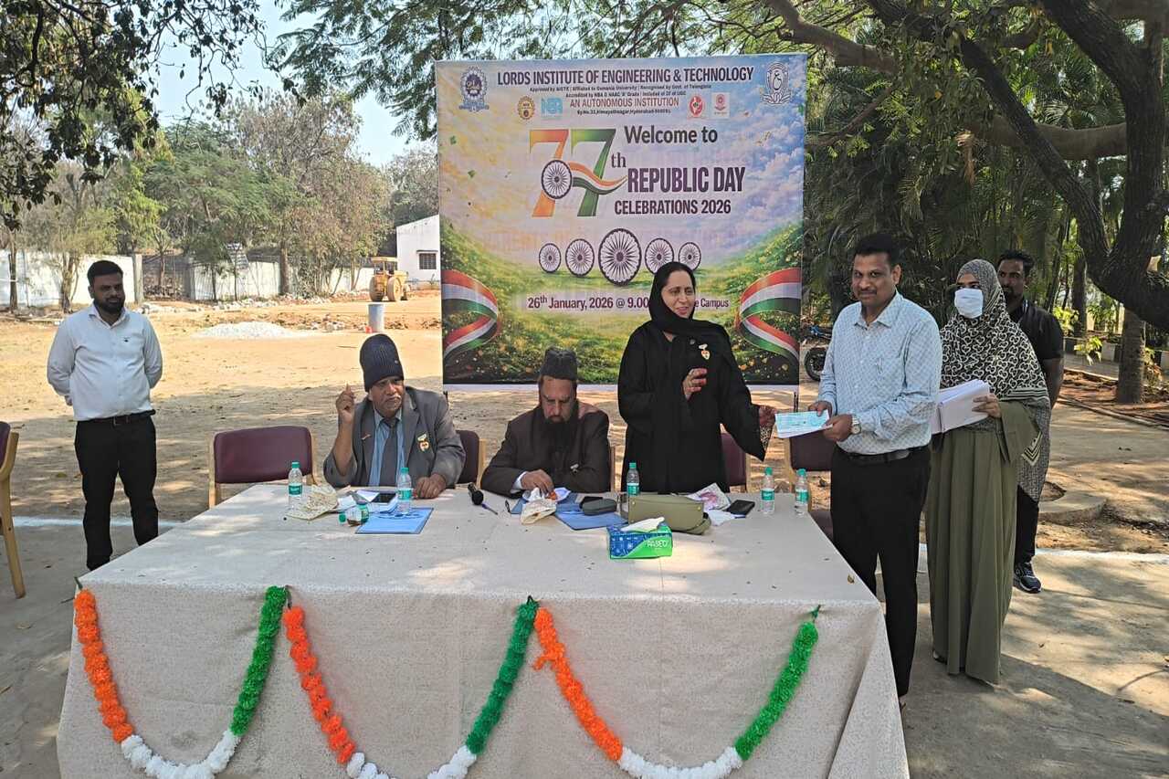 Description: Lords Institute of Engineering and Technology (Autonomous) celebrated the 77th Republic Day on 26th January 2026 from 9:00 AM onwards with great patriotic fervor and enthusiasm. The National Flag was hoisted by the Chairman, Janab C. A. Basha Mohiuddin, marking the beginning of the celebrations. The event fostered a strong sense of patriotism among the faculty, staff, and students. Faculty members were felicitated with appreciation awards and incentives for their research contributions, excellent performance in NPTEL Certification Examinations, and were also provided financial support for obtaining professional memberships.