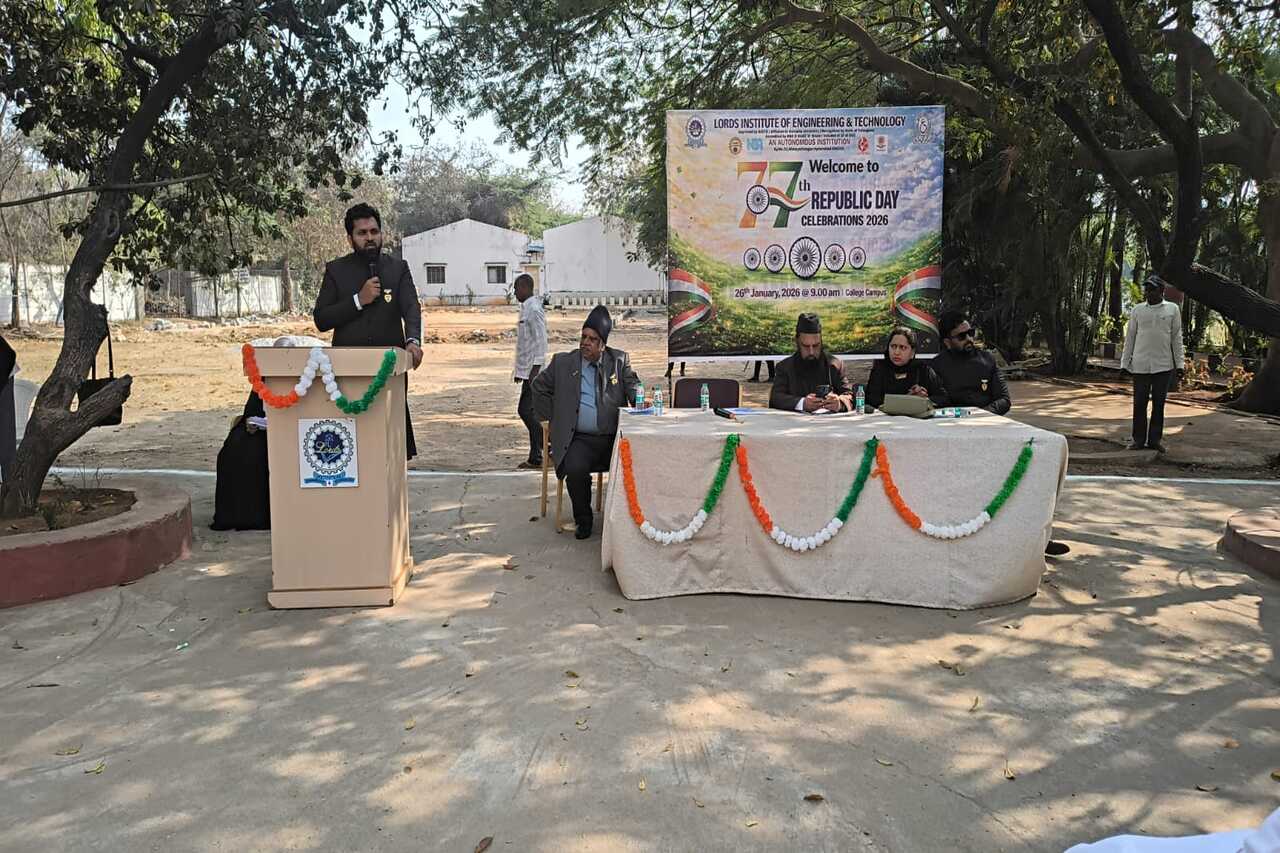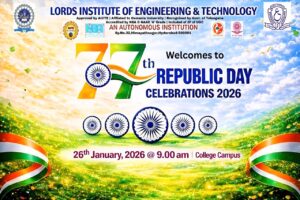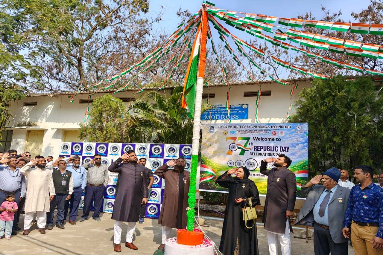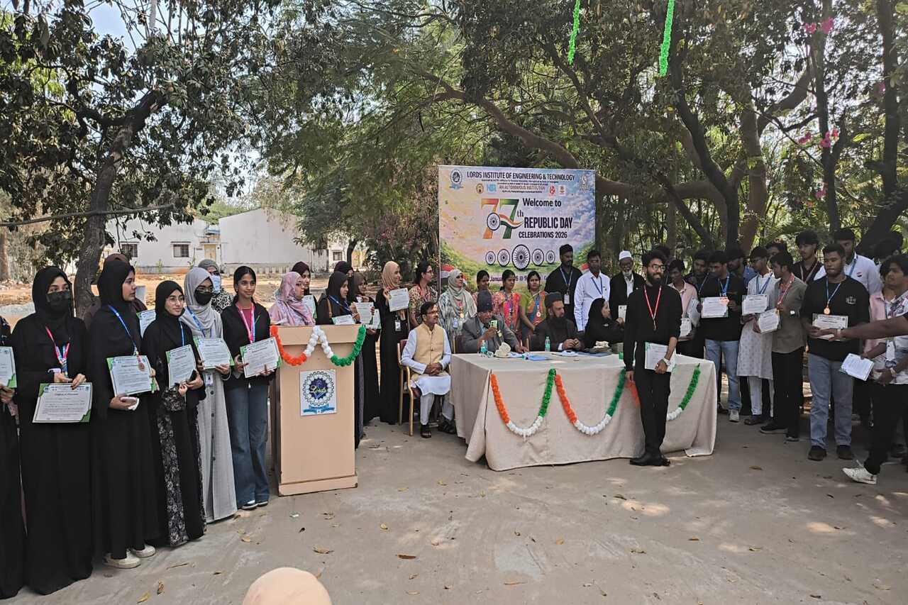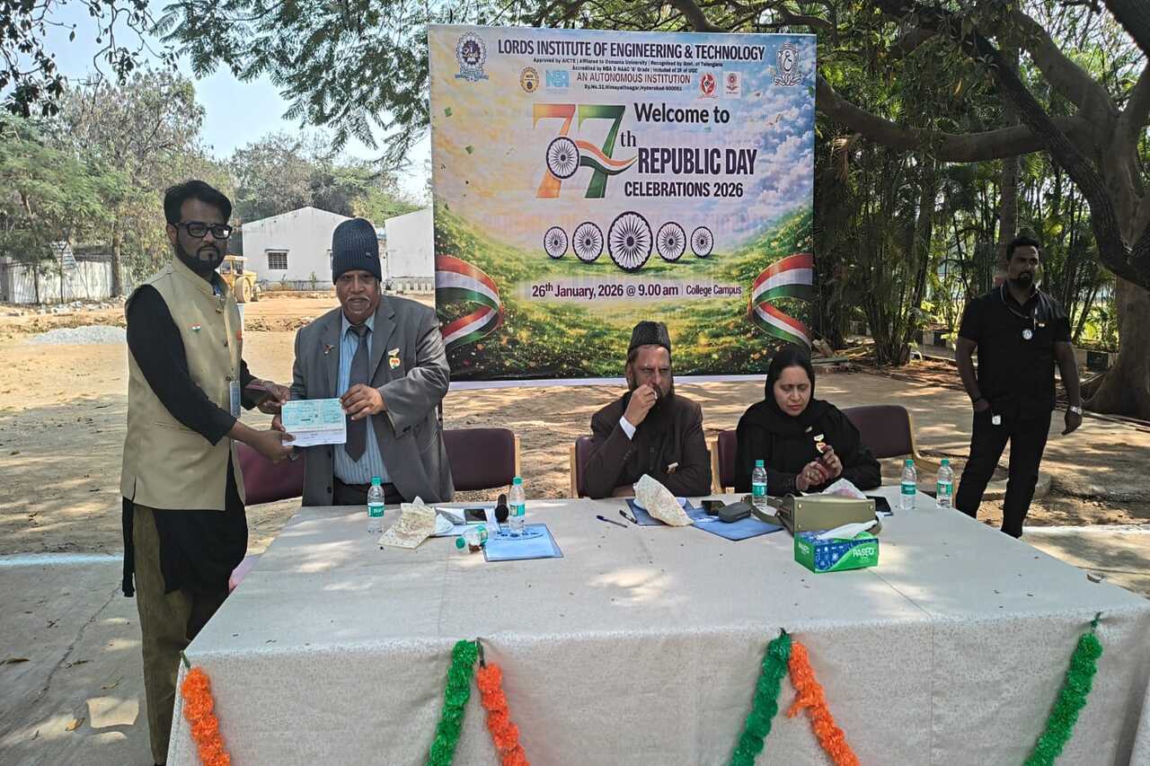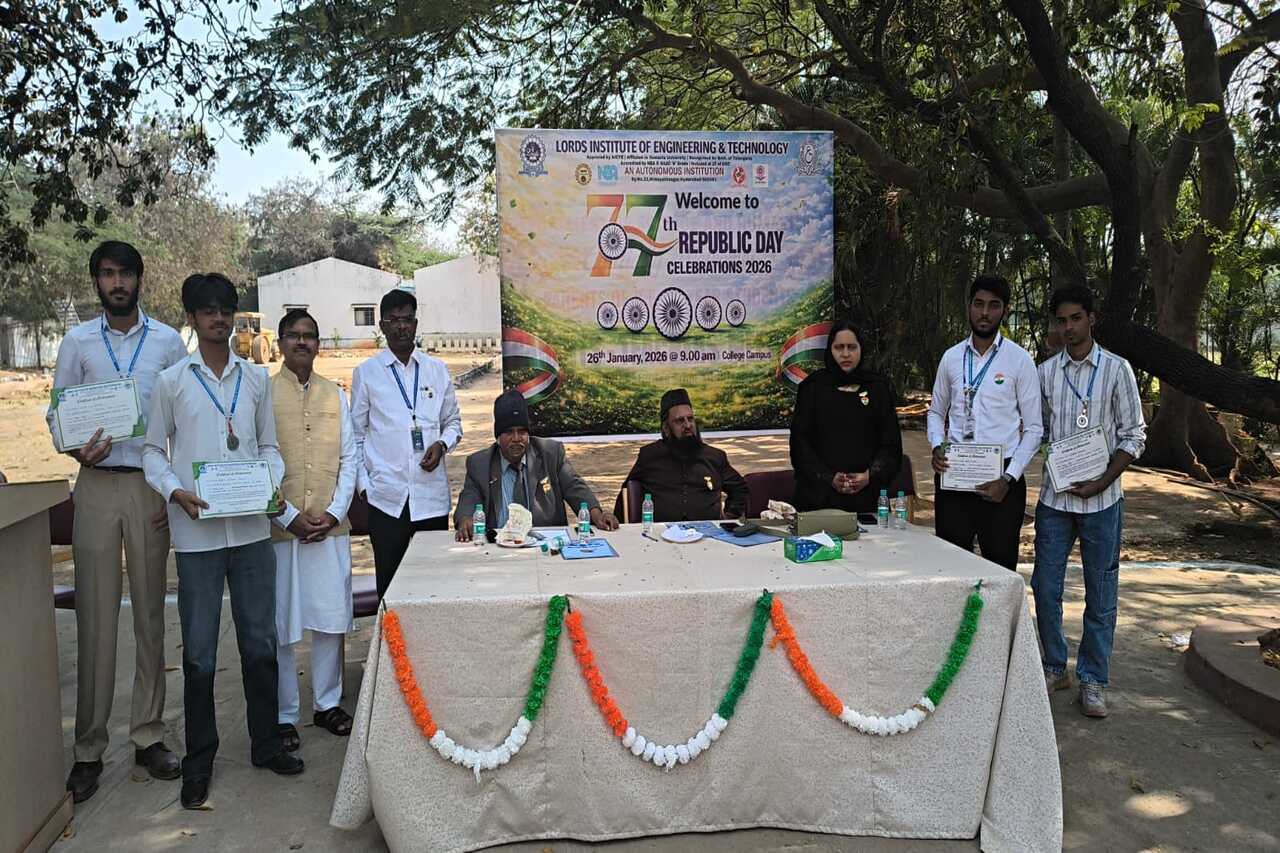 Description: Lords Institute of Engineering and Technology (Autonomous) celebrated the 77th Republic Day on 26th January 2026 from 9:00 AM onwards with great patriotic fervor and enthusiasm. The National Flag was hoisted by the Chairman, Janab C. A. Basha Mohiuddin, marking the beginning of the celebrations. The event fostered a strong sense of patriotism among the faculty, staff, and students. Faculty members were felicitated with appreciation awards and incentives for their research contributions, excellent performance in NPTEL Certification Examinations, and were also provided financial support for obtaining professional memberships.