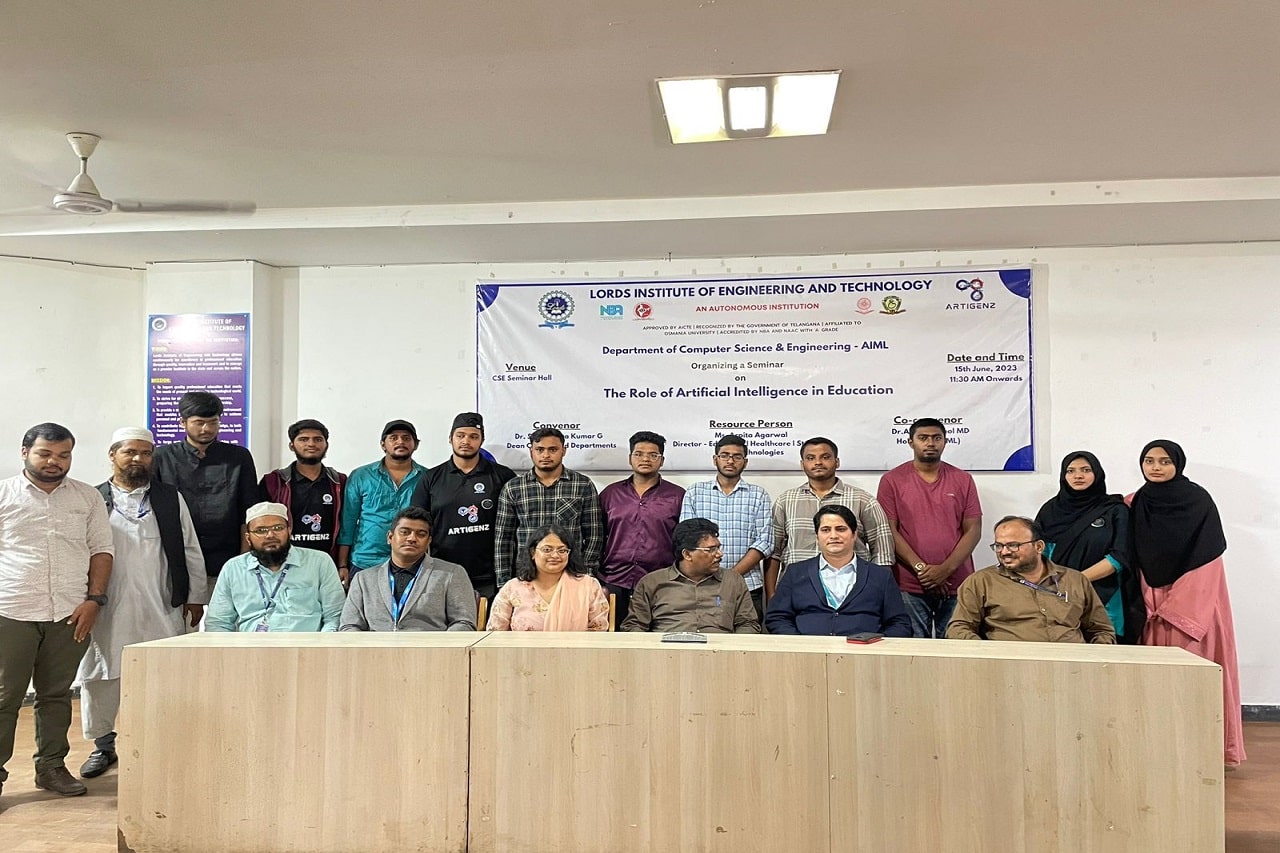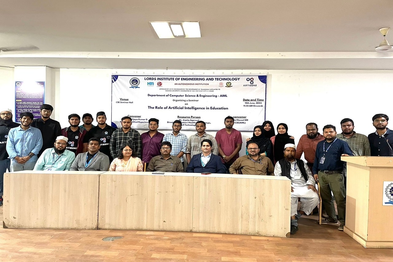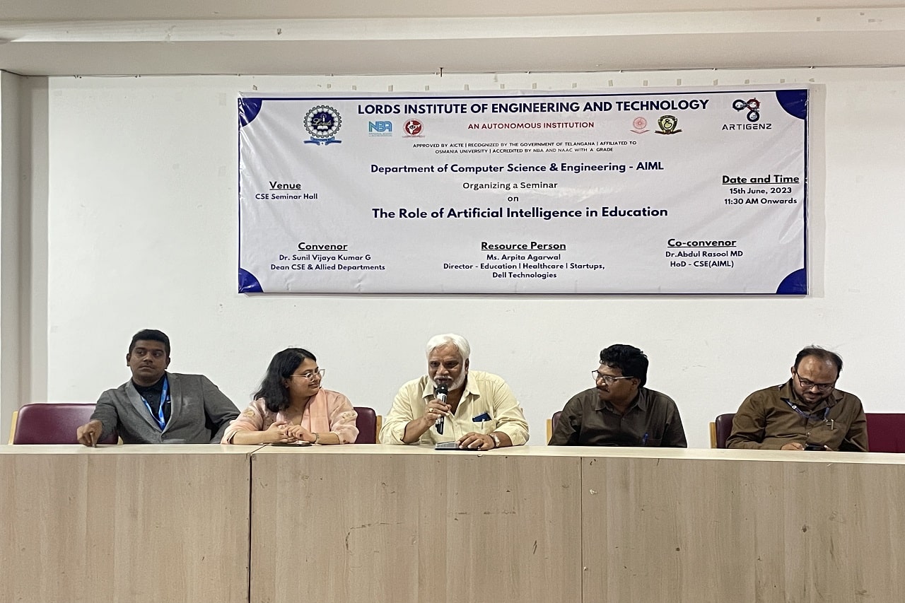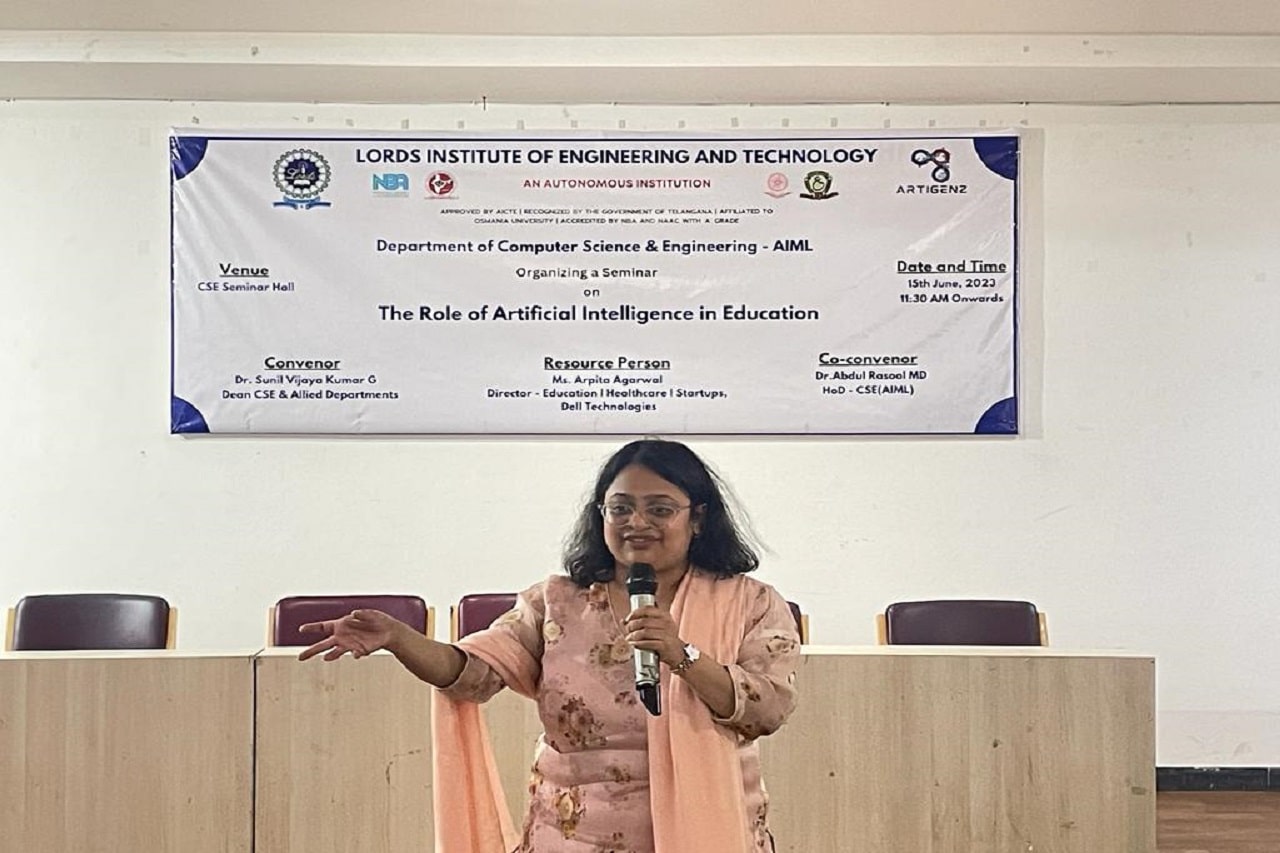 Department of CSE-AIML conducted a Seminar on “The Role of Artificial Intelligence in Education” at Lords Institute of Engineering and Technology Autonomous. The event was attended by 150 students. The Speaker was Ms. Arpita Agarwal Director- Education | Healthcare | Startups, Dell Technologies. Session was interactive and very much appreciated by the students and faculty members.