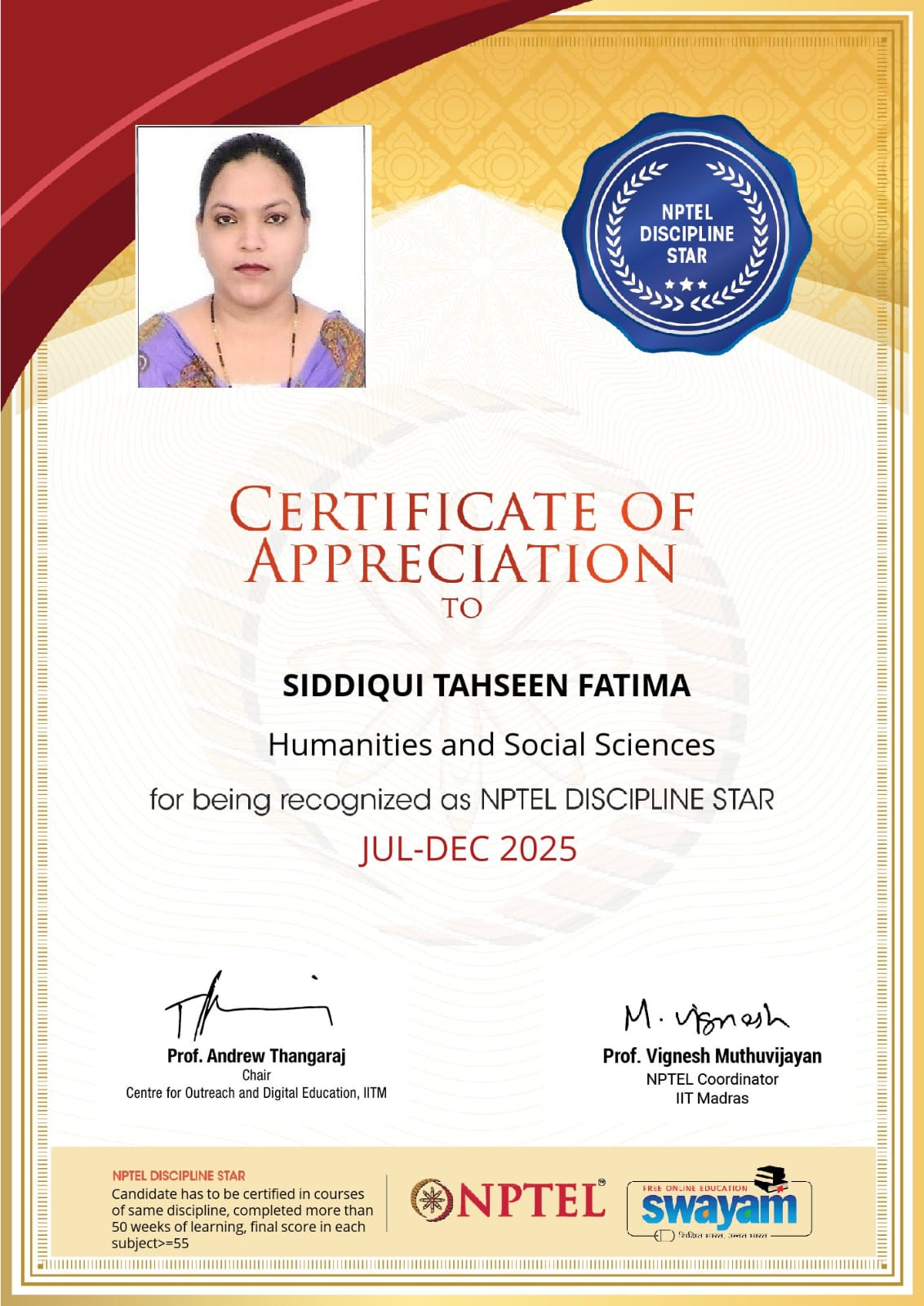 - Mrs.Siddiqui Tahseen Fatima has been recognized as an NPTEL Discipline Star for his outstanding academic excellence during the July–December 2025 semester. – View