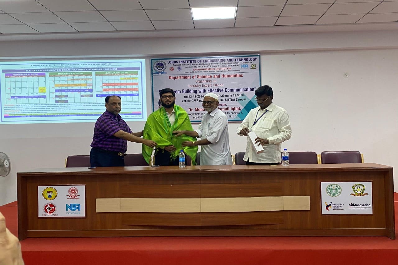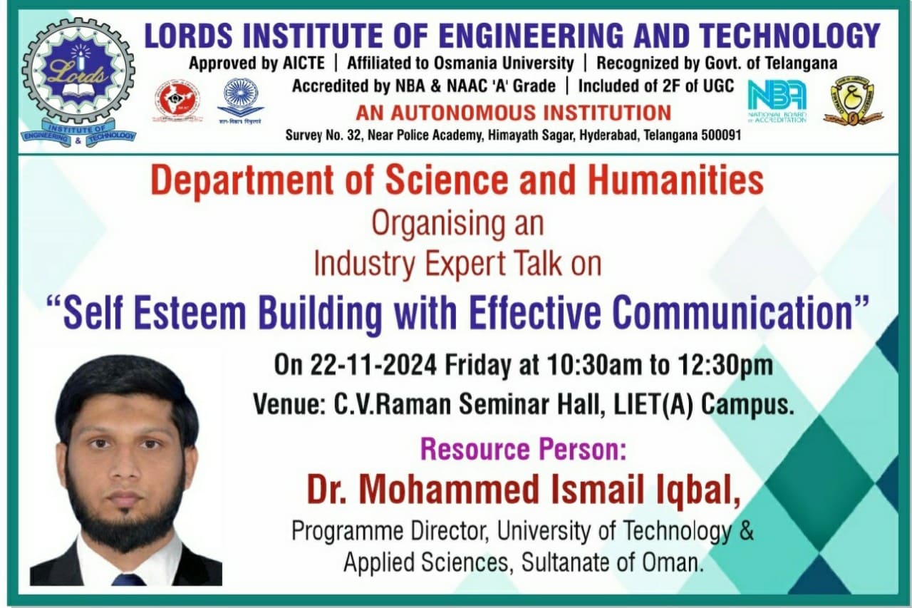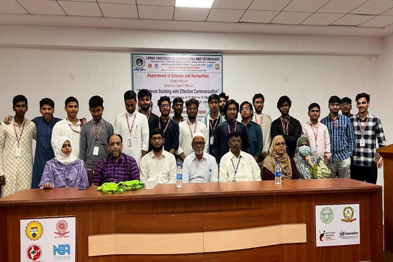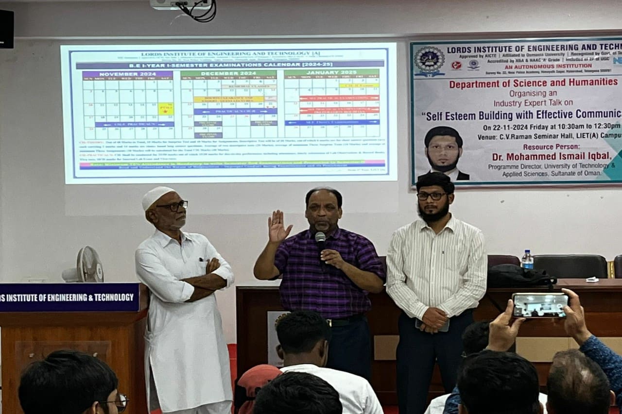Description: The Department of Science and Humanities at Lords Institute of Engineering and Technology hosted an Industry Expert Talk titled “Self-Esteem Building with Effective Communication” by Dr. Mohammed Ismail Iqbal on 22nd November from 10.30 am to 12.30 pm. The session aimed to deepen students’ understanding of the vital connection between self-esteem and communication in achieving personal and professional success. Dr. Iqbal emphasized that self-esteem is shaped by our thoughts, experiences, and interactions, directly influencing the way we communicate with others. This event was designed to boost students’ confidence and interpersonal skills, fostering both their personal and professional growth.