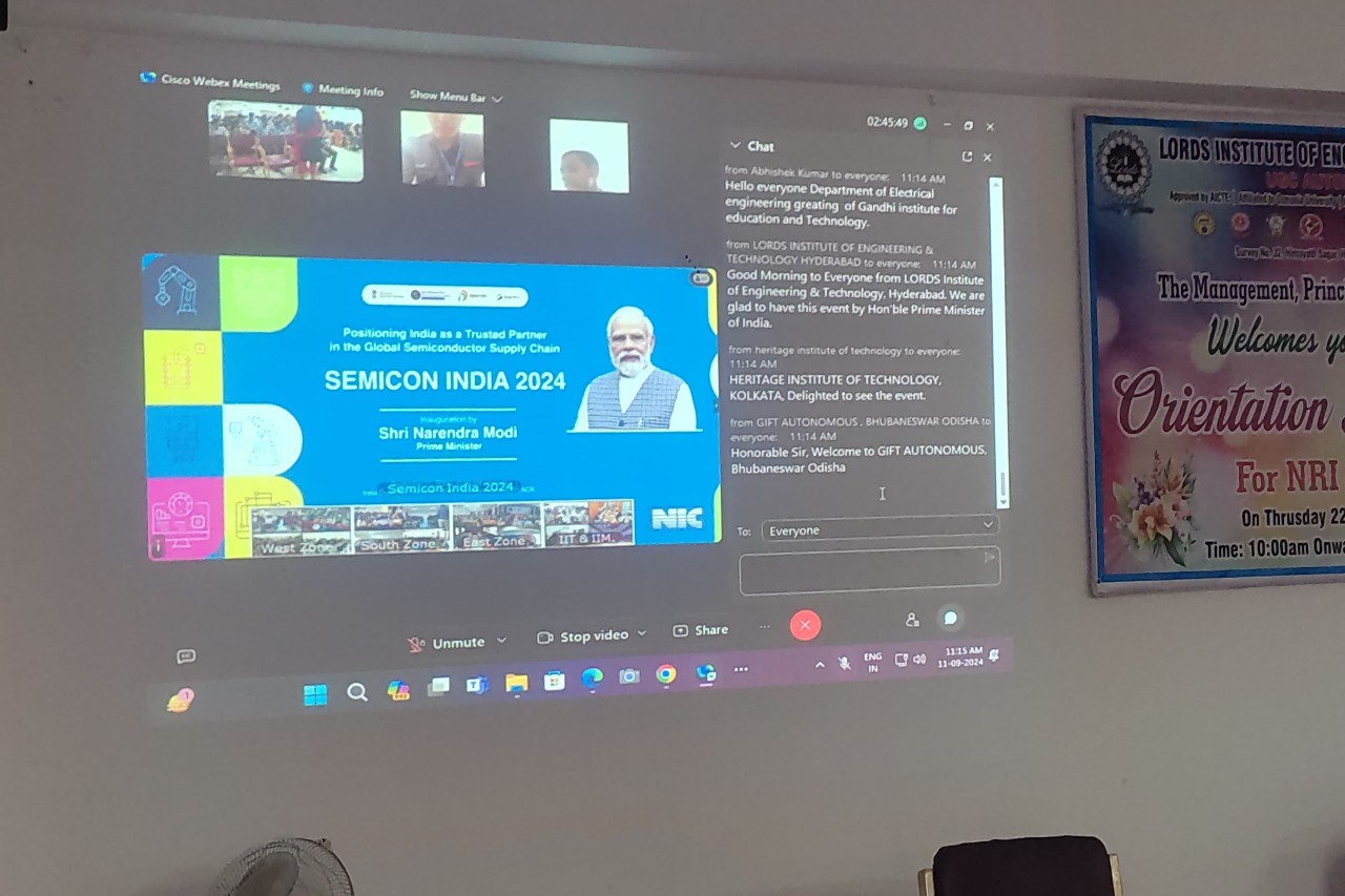 Description: Lords Institute of Engineering and Technology has participated in the Inauguration session by Honorable Prime Minster of India on Semicon India 2024, Sep 11 at India Expo Mall, Greater Noida Delhi NCR through Video Conferencing. The Event has witnessed all participants across the Nation. The Session has enlightened about the growing needs of semiconductors industry and their vast use in different domains.