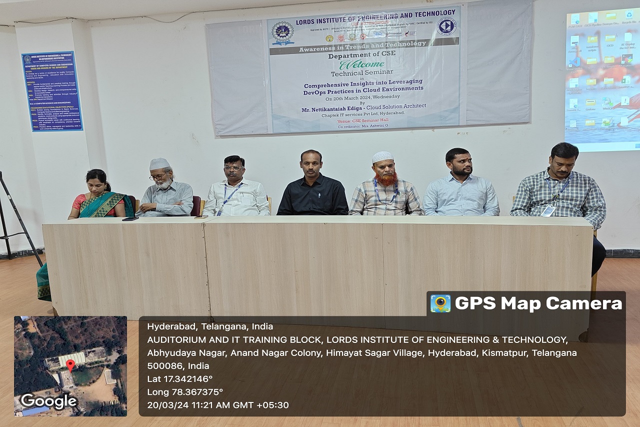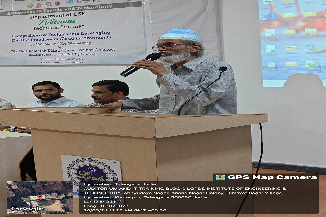 A one-day seminar was conducted on “Comprehensive Insights into Leveraging DevOps Practices in Cloud Environments” by the department of Computer Science and Engineering -Lords college of engineering and technology. This event was conducted at CSE Seminar Hall with students participating. The speakers Mr.Nettikantaiah Ediga (IT recruiter and Career Matchmaker, CareerX, Hyderabad) and Mr. Narasimha Mikkilineni (Founder & CEO Lace Academy) delivered a seminar about what a full stack web development means ,who is called a full stack web developer , how to start a career in it and its high demand in the market.