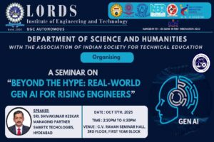 Description: The Department of Science and Humanities, in collaboration with ISTE, successfully organized a seminar titled “Beyond the Hype: Real-World Gen AI for Rising Engineers” on October 17, 2025. The session was delivered by Sri Shivakumar Keskar, Managing Partner at SmartX Technologies, Hyderabad, and attracted over 300 enthusiastic participants. The seminar provided valuable insights into the practical applications of Generative AI and its transformative impact on engineering innovation.
