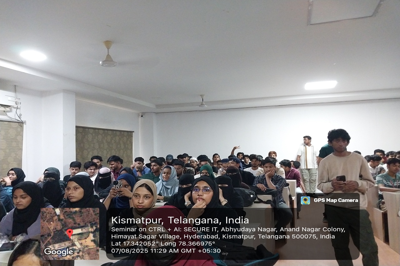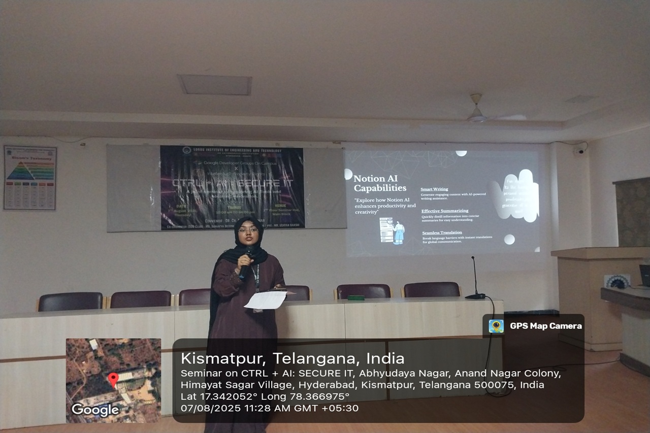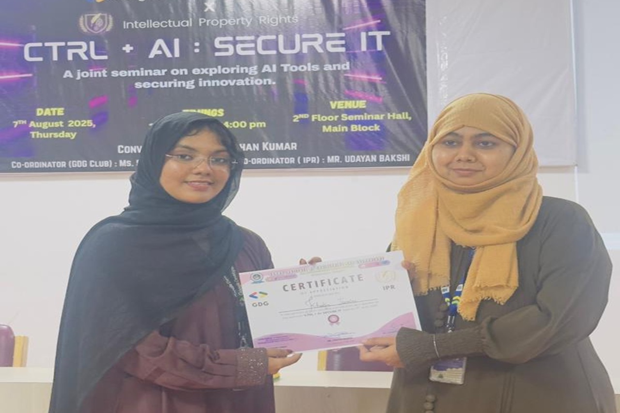 Description about the event (50 Words): The GDG and IPR Cell jointly organized a seminar titled CTRL + AI: Secure IT. The seminar focused on the intersection of Artificial Intelligence and Intellectual Property Rights, highlighting how modern AI Tools & technologies can be leveraged to enhance digital security systems that can be transformed into a project which will be converted into paper publication and The event brought together experts, professionals, and students to discuss pressing challenges in IT security and how AI is transforming the way we approach threat detection, data protection, and system resilience. Overall, it served as an insightful platform to explore AI Tools to provide innovative solutions for securing the digital world. Seminar was concluded by Quiz on the topics explained during the seminar. Participants have appreciated the event. Total 198 participants attended the seminar from various departments.