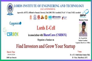 Description: The aim was to guide the participants on finding the Investors for their Startup. Mr.Praneet Palli, Technical Consultant, Capgemini. Commencing the session Having a good amount of experience in this area, the speaker had a very practical approach and lots of real life examples and could impart participants a better understanding of Start Up and the tasks associated with it in detail. He pointed out Start Up and finding the Investors. He helped shape the mindsets of participants in the direction of Start Up.