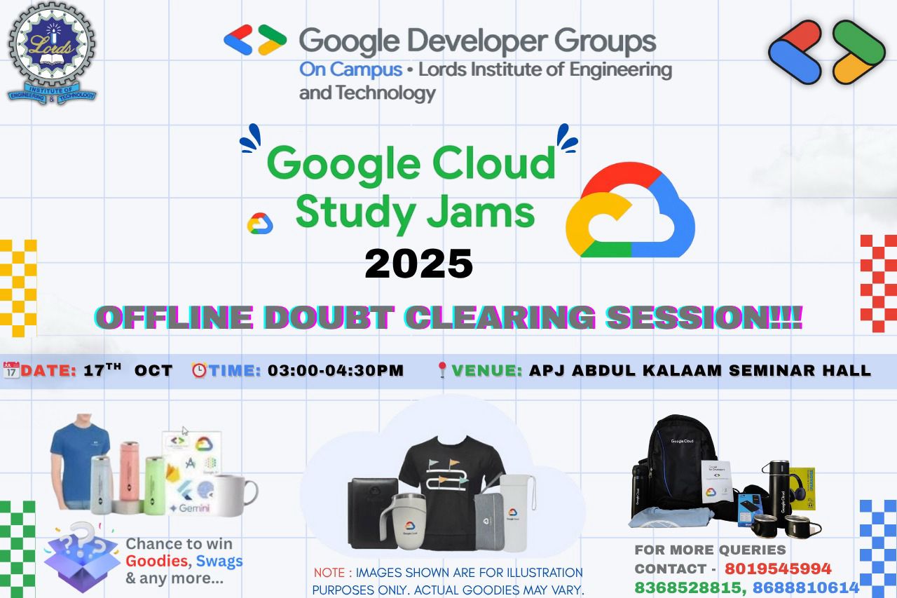 Description: The GDG Club successfully conducted a Google Cloud Study Jam Doubt Clarification Session on 17th October from 2:30 PM to 4:30 PM in the APJ Abdul Kalam Azad Seminar Hall, Main Block. The session was designed to provide hands-on guidance and resolve participants’ queries related to the Study Jam activities. It was an interactive and highly engaging learning experience, where students received step-by-step assistance on redeeming Google Cloud credits, starting and navigating through Qwiklabs, and completing skill badges efficiently.