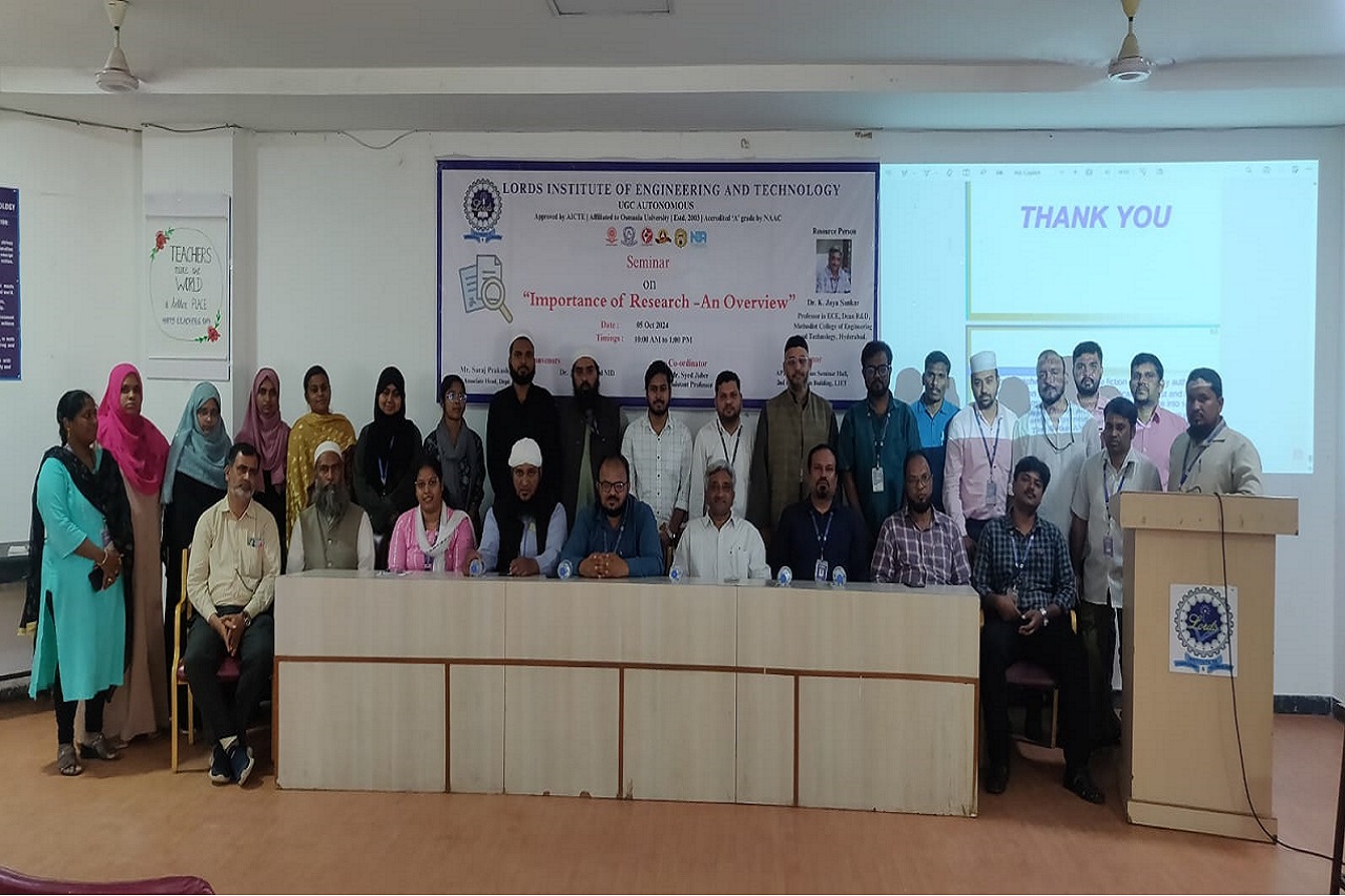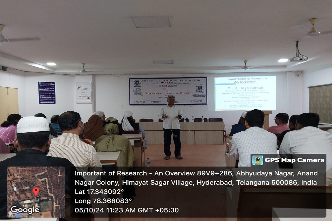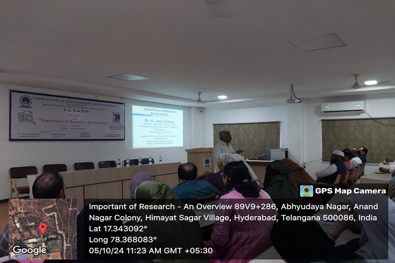 Description: The seminar on Importance of Research and -An overview was conducted on 05-10-2024 at Lords Institute of Engineering and Technology led by renowned expert Dr. K. Jaya Sankar. The engaging presentation highlighted research’s crucial role in advancing knowledge, innovation, and solving real-world problems. Emphasizing critical thinking, analytical skills, and interdisciplinary collaboration, Dr. Sankar shared inspiring examples of successful research projects and their societal impact. The interactive session fostered meaningful discussions and networking among attendees, inspiring a research-oriented mindset. The seminar was a resounding success, providing valuable insights and encouraging participants to explore new research possibilities.