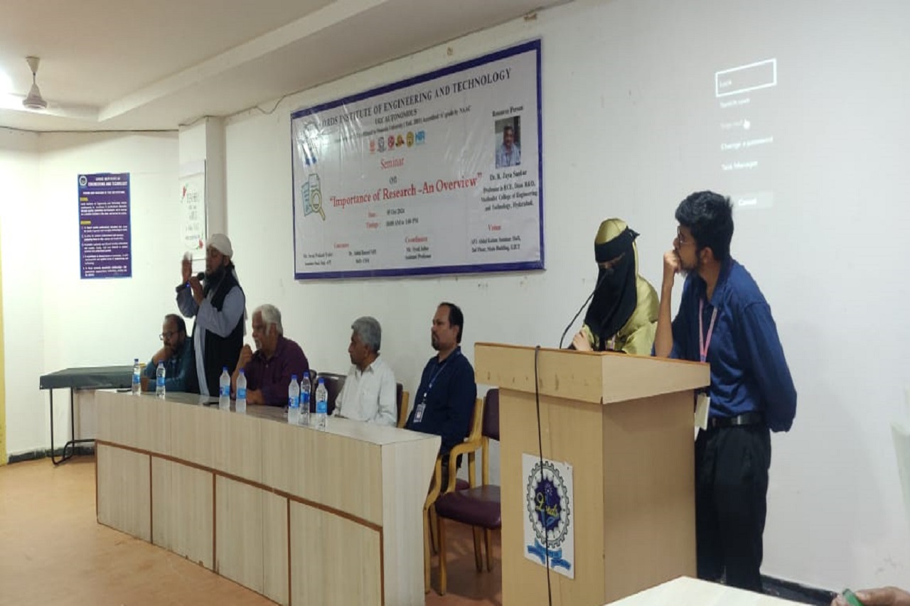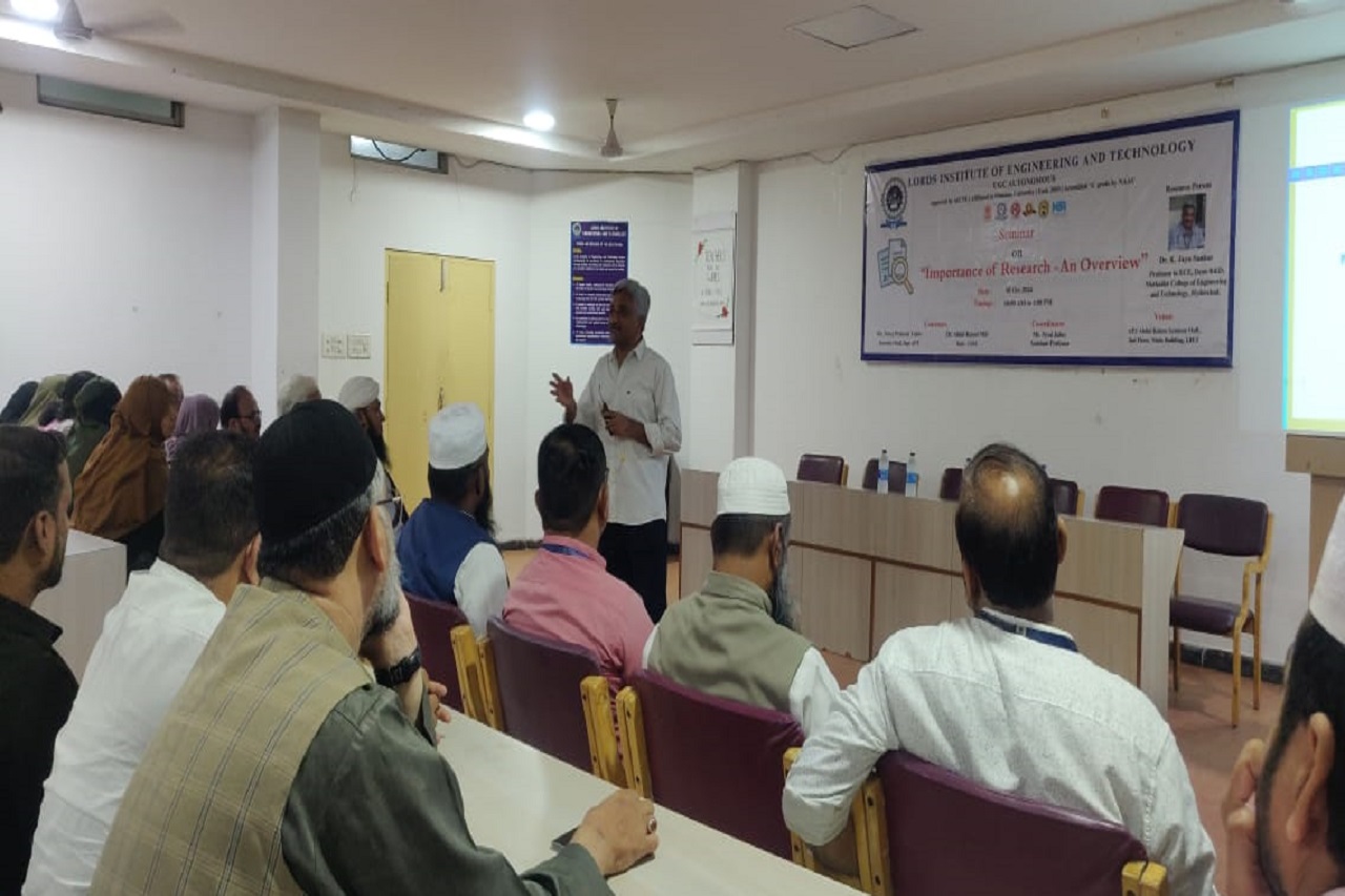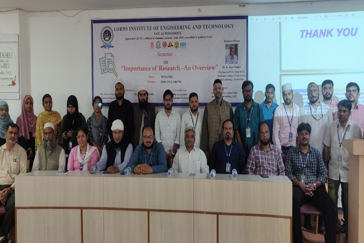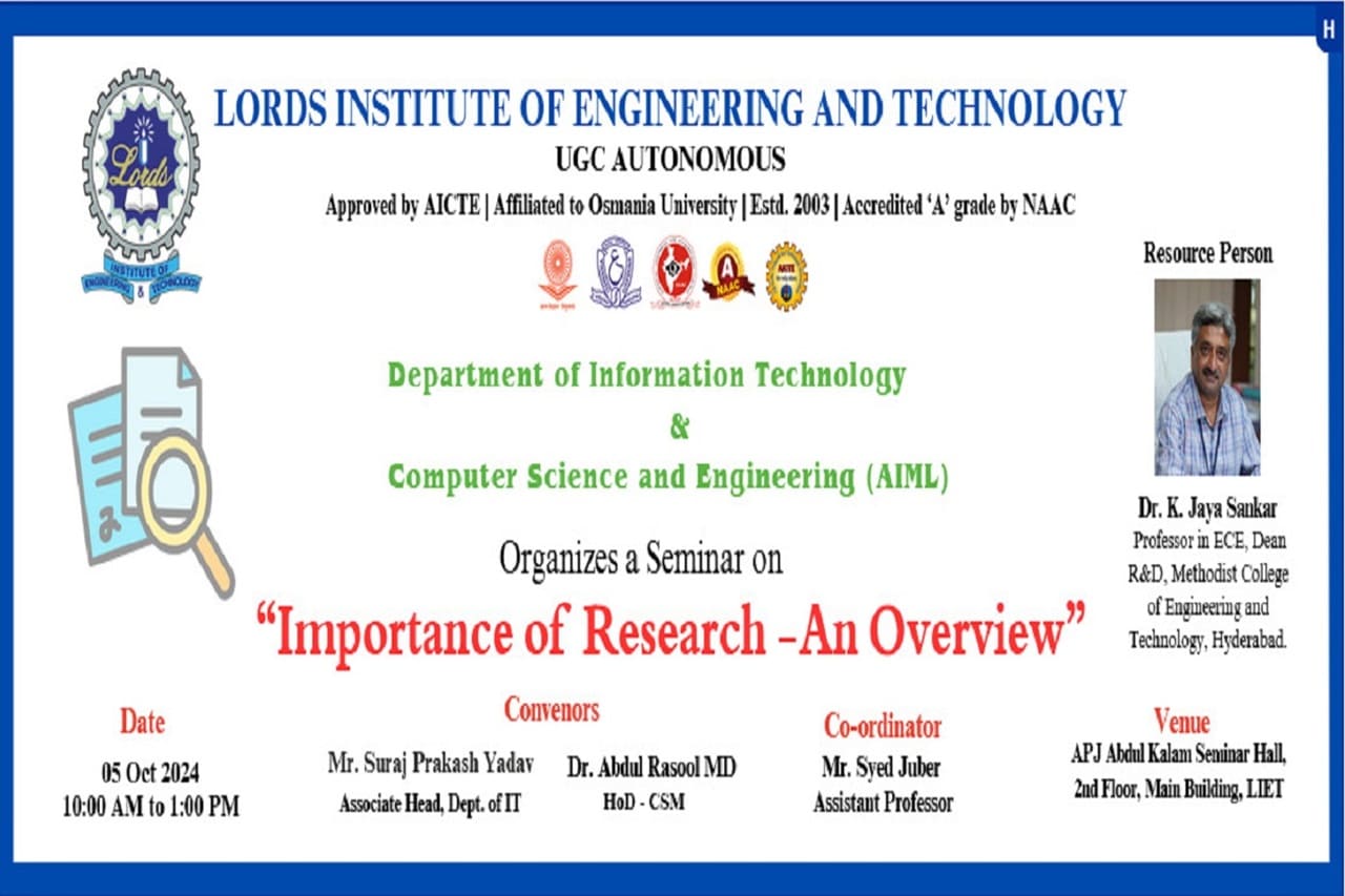 Description: The seminar on Importance of Research and -An overview was conducted on 05-10-2024 at Lords Institute of Engineering and Technology led by renowned expert Dr. K. Jaya Sankar. The engaging presentation highlighted research’s crucial role in advancing knowledge, innovation, and solving real-world problems. Emphasizing critical thinking, analytical skills, and interdisciplinary collaboration, Dr. Sankar shared inspiring examples of successful research projects and their societal impact. The interactive session fostered meaningful discussions and networking among attendees, inspiring a research-oriented mindset. The seminar was a resounding success, providing valuable insights and encouraging participants to explore new research possibilities.