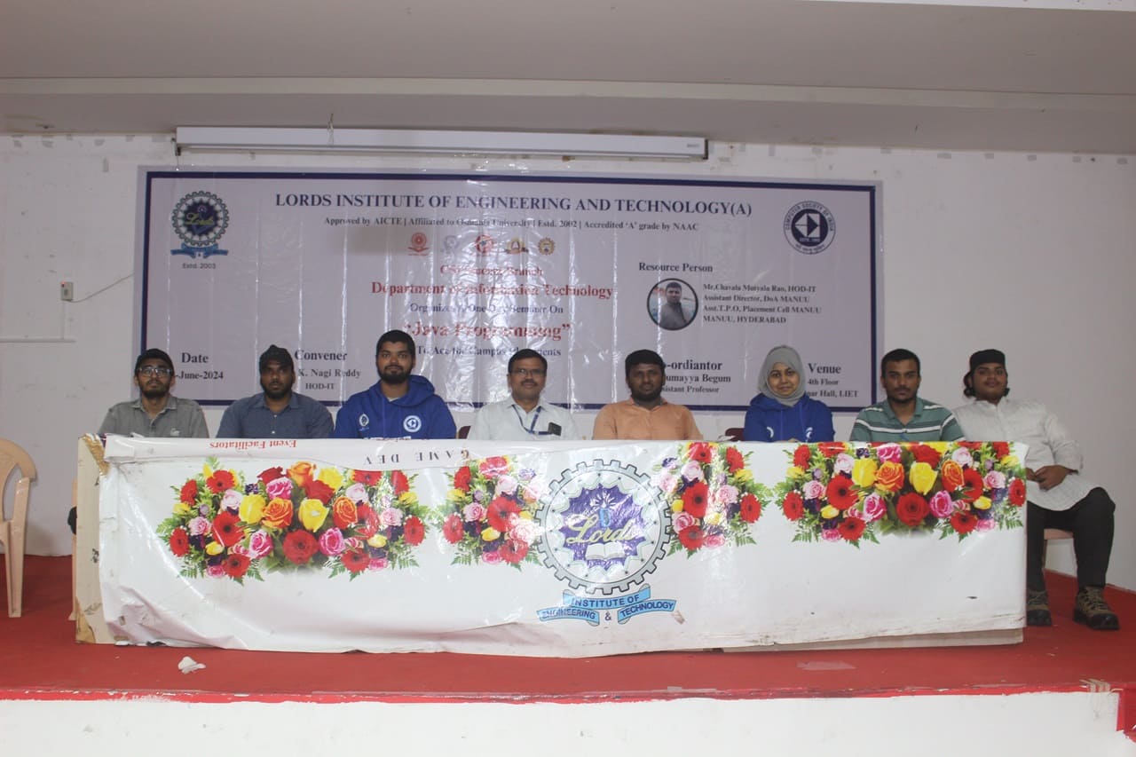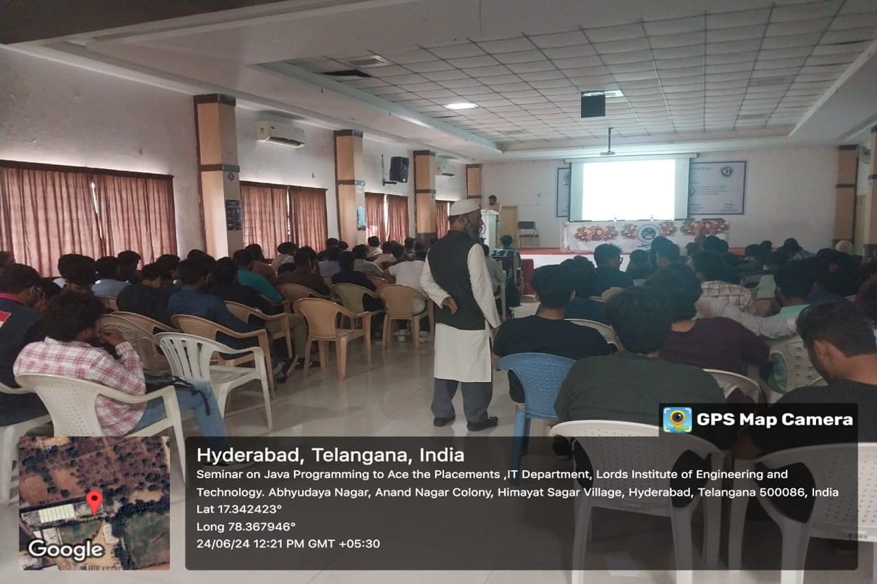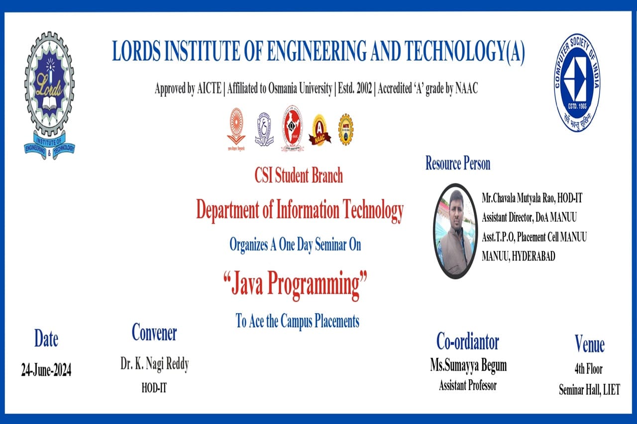 Description: The Seminar on “Java Programming to Ace the Campus Placement” was organized by CSI Student Branch of IT Department on 24th June 2024 from 10AM to 1:30 PM at Lords Institute of Engineering and Technology. The Seminar on “Java Programming to Ace the Campus Placement” was conducted for the benefit of Third-Year Students. The resource person of the workshop is Mr. Chavala Mutyala Rao, HOD-IT,Assistant Director, DOA MANUU.