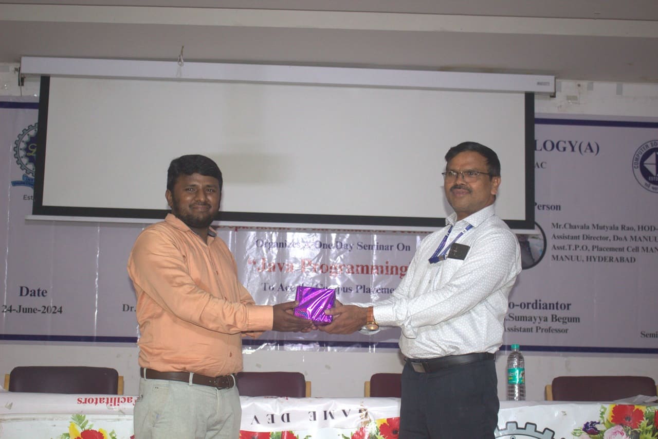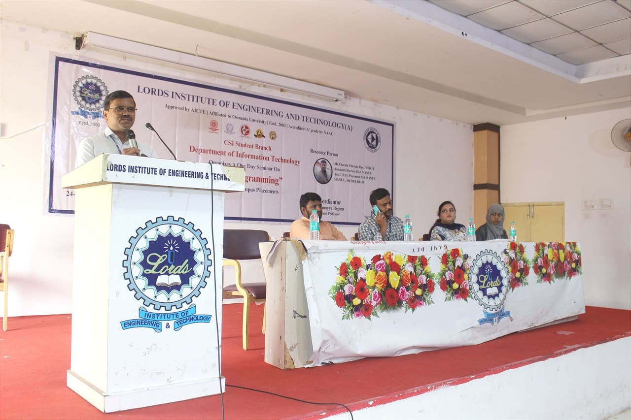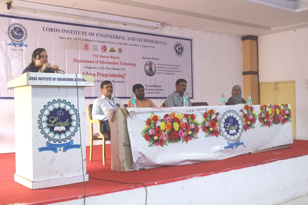 Description: The Seminar on “Java Programming to Ace the Campus Placement” was organized by CSI Student Branch of IT Department on 24th June 2024 from 10AM to 1:30 PM at Lords Institute of Engineering and Technology. The Seminar on “Java Programming to Ace the Campus Placement” was conducted for the benefit of Third-Year Students. The resource person of the workshop is Mr. Chavala Mutyala Rao, HOD-IT,Assistant Director, DOA MANUU.