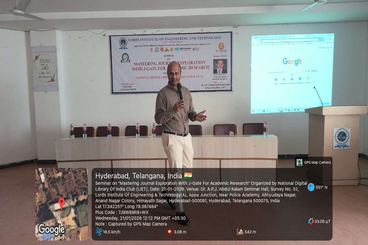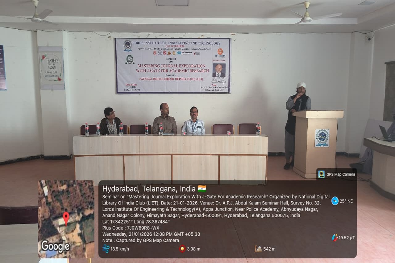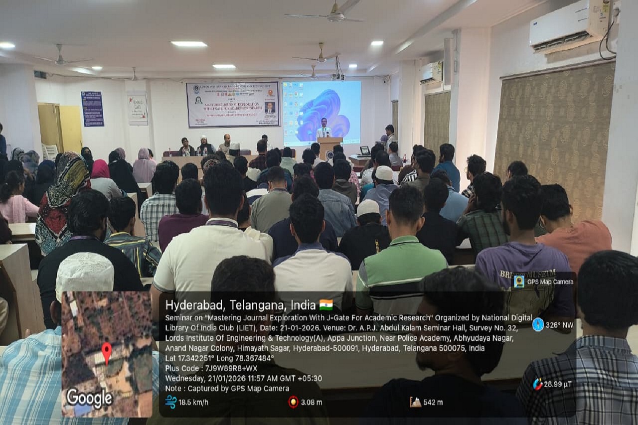 Description: National Digital Library of India Club in Association with Central Library Committee Organized on “Mastering Journal Exploration with J-Gate for Academic Research, conducted on 21.01.2026 from 11:30 AM to 1:00 PM in the A. P. J. Abdul Kalam Seminar Hall, 2nd Floor, L. I. E. T. main Block. The J-Gate Plus Seminar is an awareness program designed to introduce students to the features and benefits of the J-Gate Plus platform. The seminar helps participants understand how to access scholarly journals, research articles, conference papers, and other academic resources useful for learning, teaching, and research. It also guides students and faculty on effective use of J-Gate Plus for academic and research excellence. The Resource Person explained in-depth to get more informative knowledge.