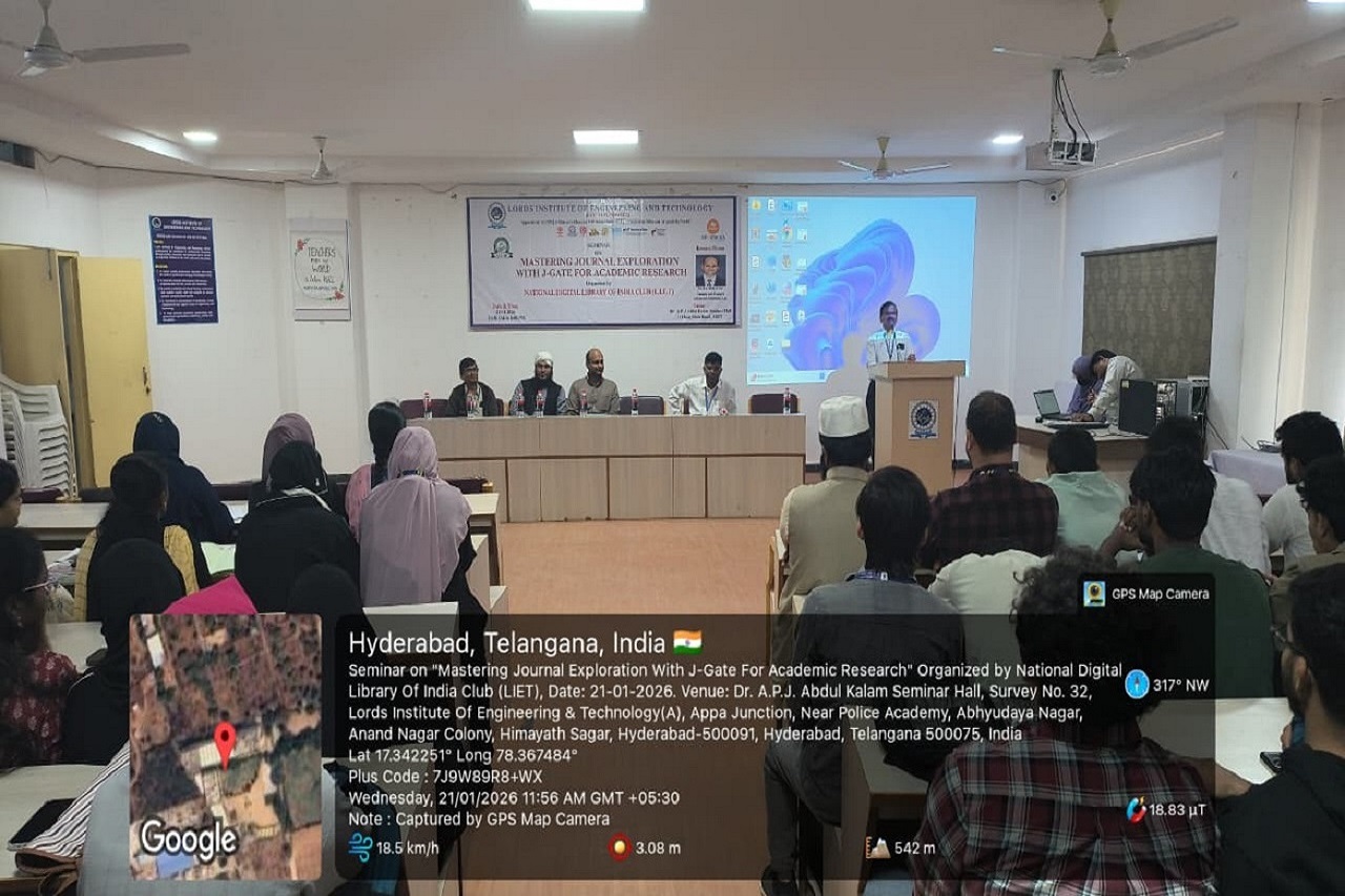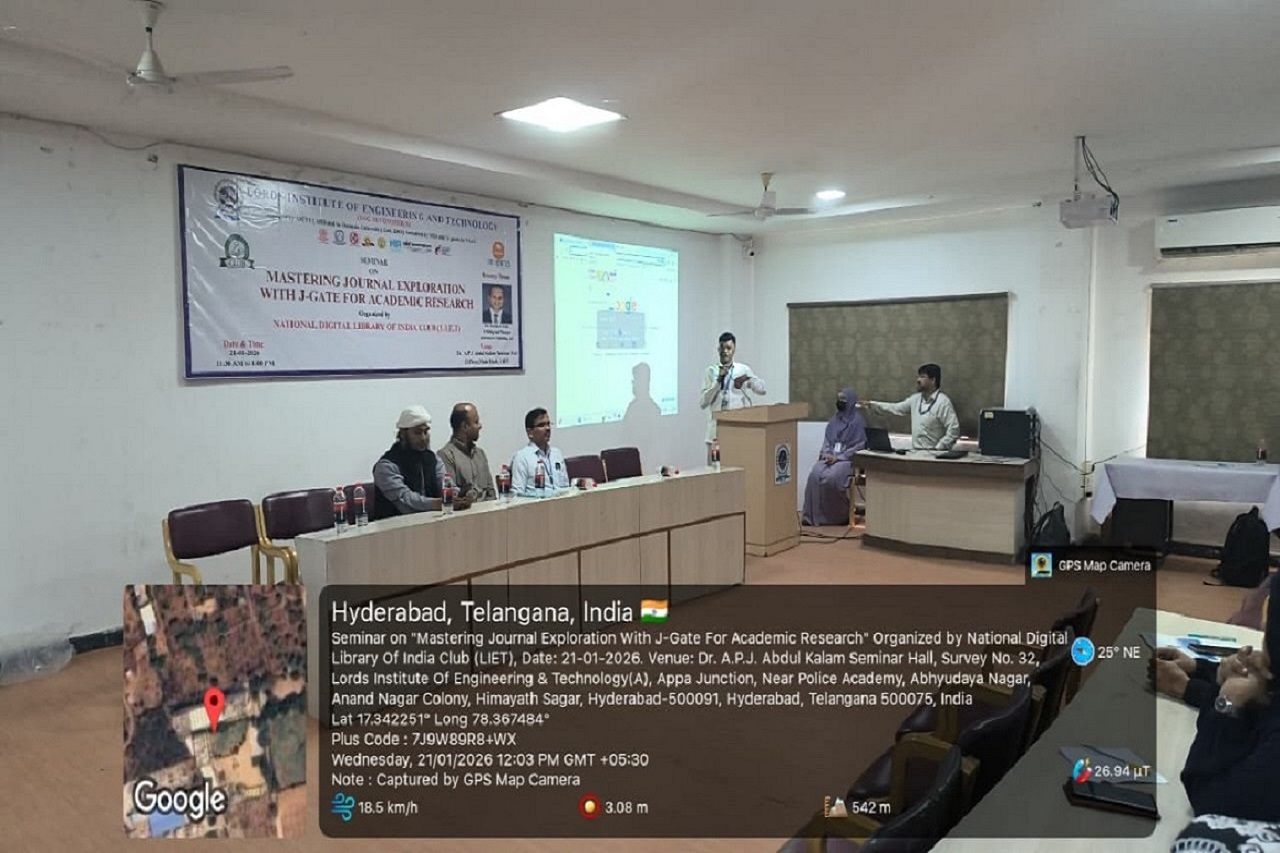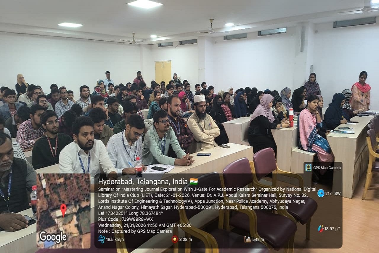 Description: National Digital Library of India Club in Association with Central Library Committee Organized on “Mastering Journal Exploration with J-Gate for Academic Research, conducted on 21.01.2026 from 11:30 AM to 1:00 PM in the A. P. J. Abdul Kalam Seminar Hall, 2nd Floor, L. I. E. T. main Block. The J-Gate Plus Seminar is an awareness program designed to introduce students to the features and benefits of the J-Gate Plus platform. The seminar helps participants understand how to access scholarly journals, research articles, conference papers, and other academic resources useful for learning, teaching, and research. It also guides students and faculty on effective use of J-Gate Plus for academic and research excellence. The Resource Person explained in-depth to get more informative knowledge.