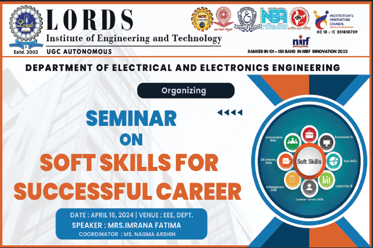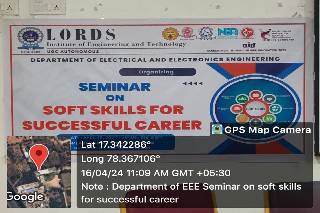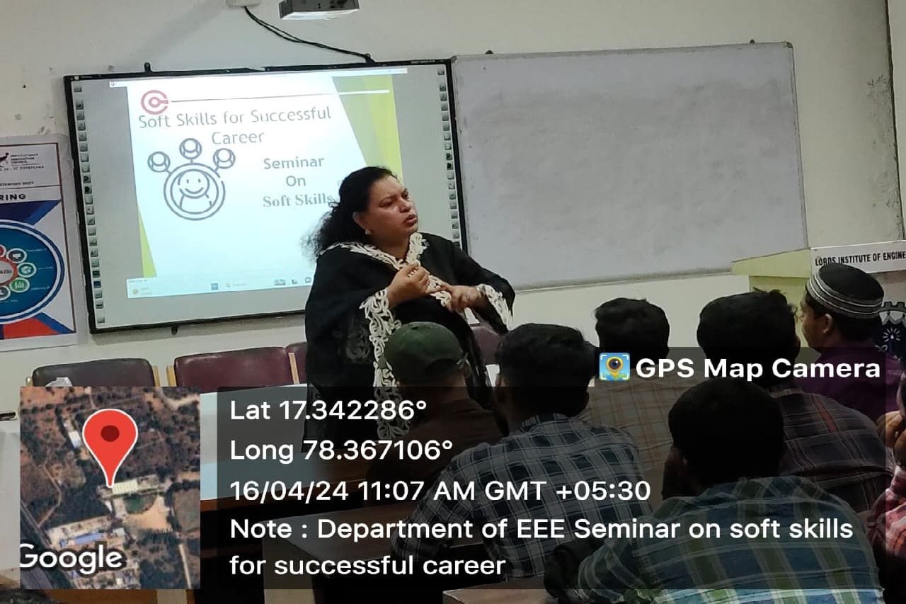 A Seminar on “Soft skills” was arranged by the department of EEE on 16/04/24 at Lords Institute of Engineering & Technology, Hyderabad. A total of 51 students have participated in the event. The main objective of this seminar was to provide some motivation & personal and professional development in which soft skills for successful careers would be useful for their academics and placements. The coordinator of the event Ms. Nagma Arshin, assistant professor EEE welcomed all the participants, resource persons of LIET who have participated towards this successful event.