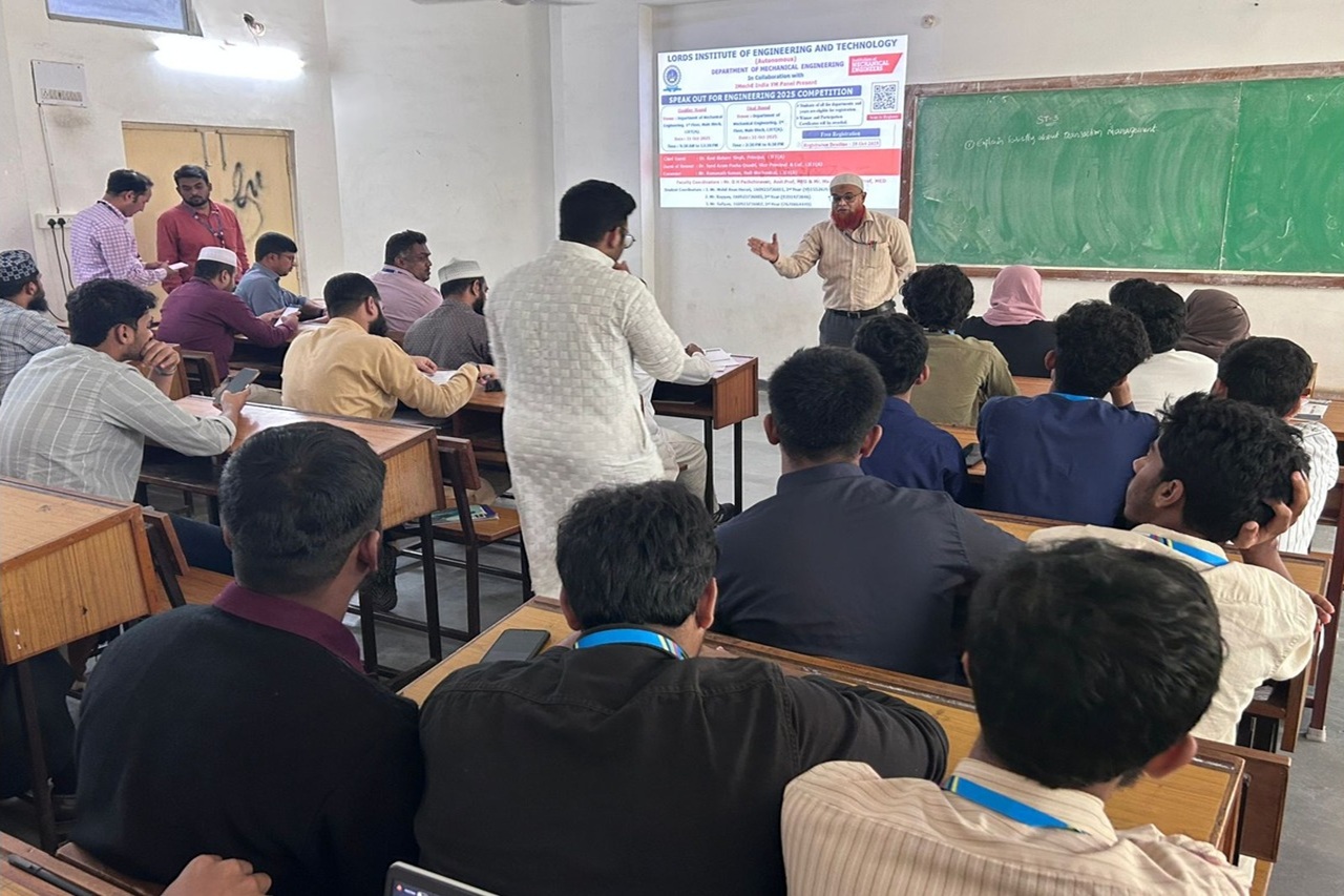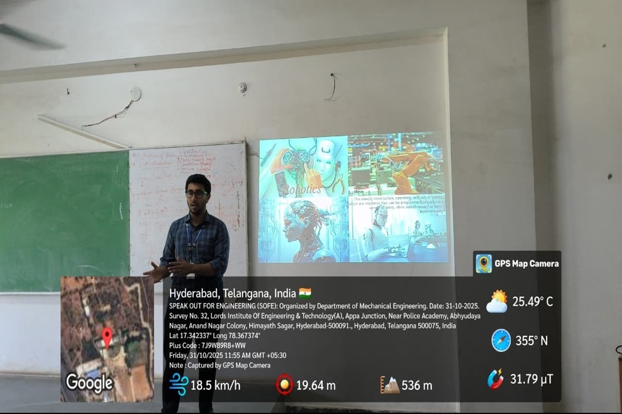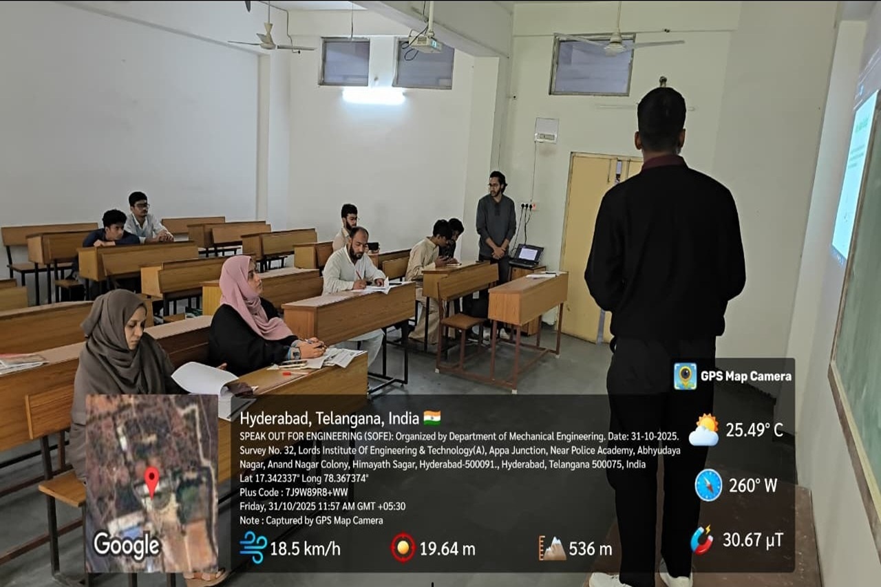 Description about the event (50 Words):The Department of Mechanical Engineering, Lords Institute of Engineering & Technology, in collaboration with the Institution of Mechanical Engineers (IMechE), successfully conducted Speak Out for Engineering (SOFE) 2025. The event saw enthusiastic participation from 128 students, showcasing their communication and presentation skills. Winners will represent Lords at the Hyderabad Finals.