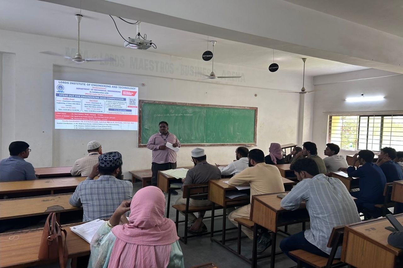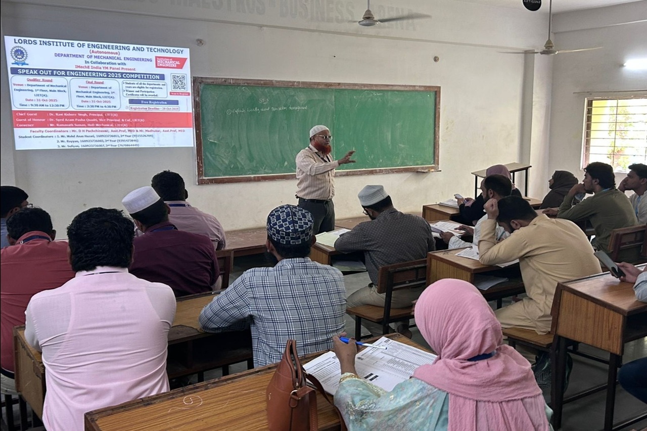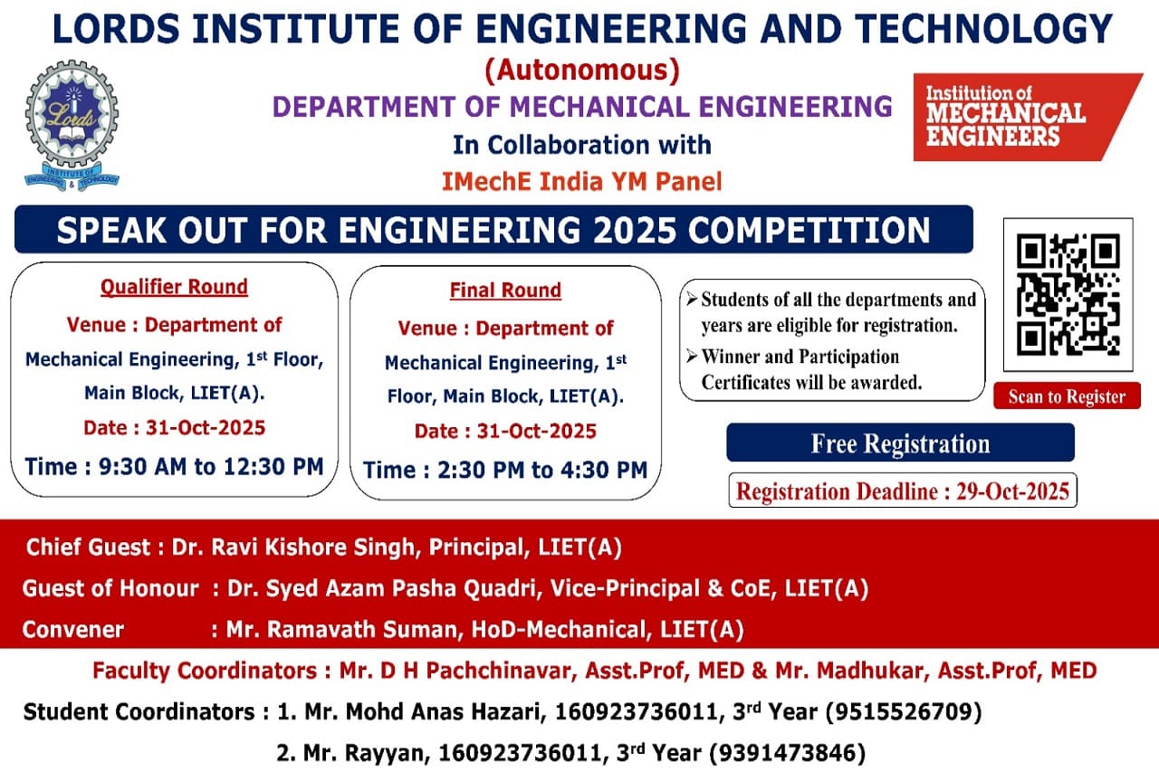 Description about the event (50 Words):The Department of Mechanical Engineering, Lords Institute of Engineering & Technology, in collaboration with the Institution of Mechanical Engineers (IMechE), successfully conducted Speak Out for Engineering (SOFE) 2025. The event saw enthusiastic participation from 128 students, showcasing their communication and presentation skills. Winners will represent Lords at the Hyderabad Finals.