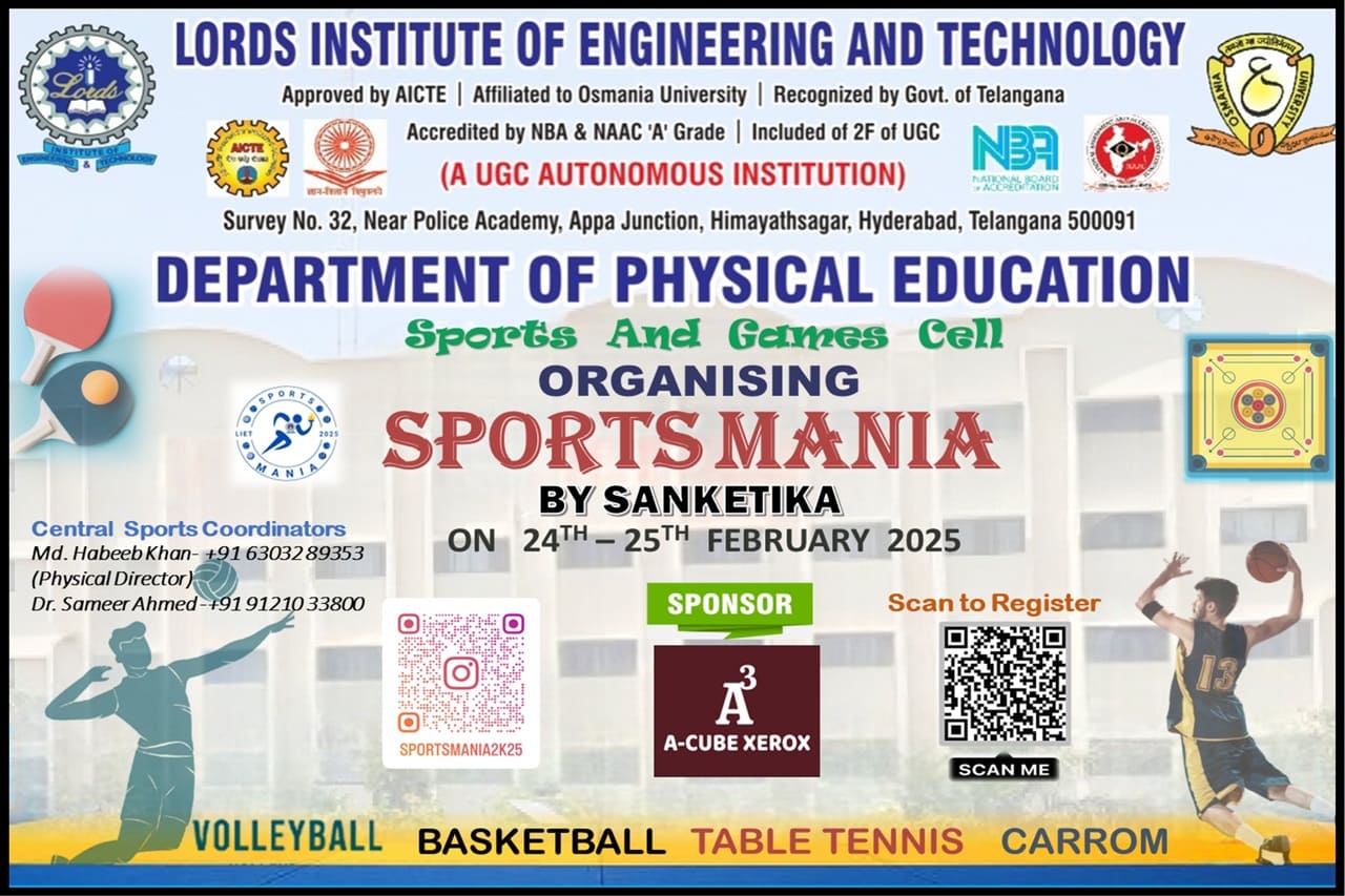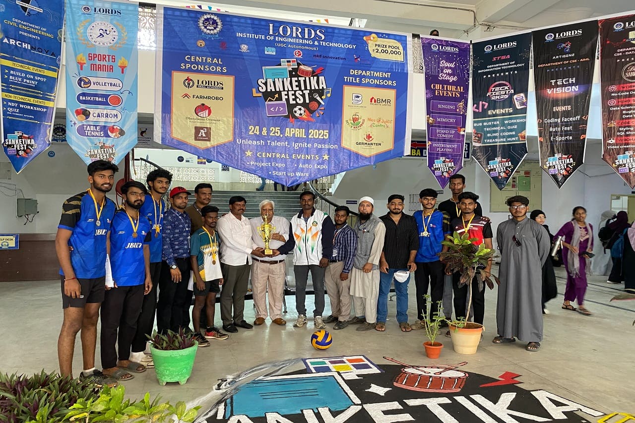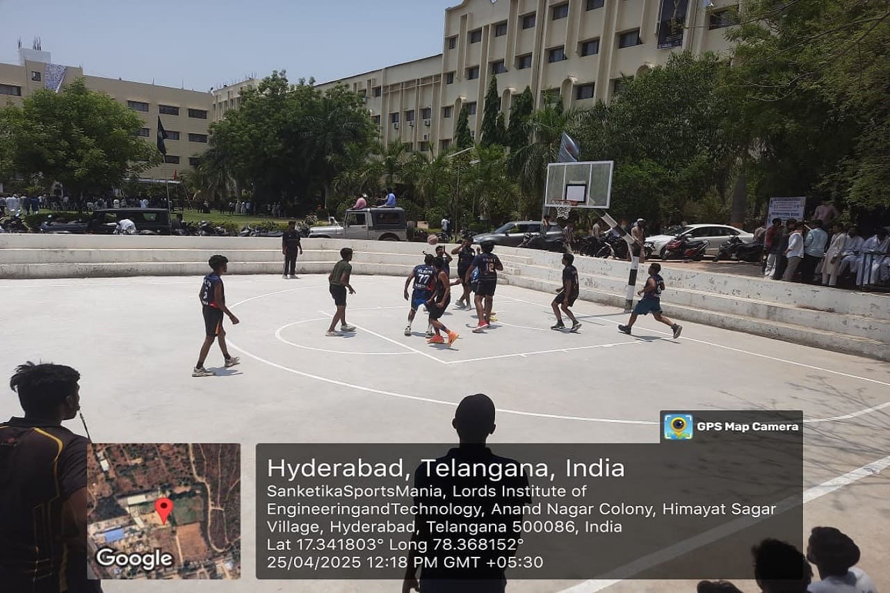 Description: Lords Institute of Engineering and Technology (A) hosted the “Sanketika Sports Mania” tournament on 24th and 25th April 2025, with over 250 students from 16 colleges participating. The event witnessed enthusiastic involvement in a variety of sports, games, and competitions, including football. The Lords Basketball Team secured first place in the tournament. The primary objectives were to nurture athletic skills, promote teamwork, enhance physical fitness, and provide participants an opportunity to familiarize themselves with the college campus.