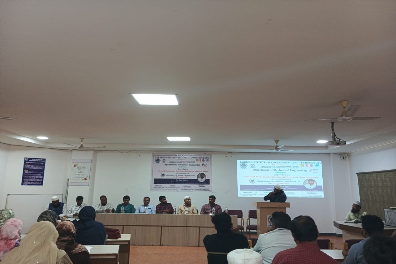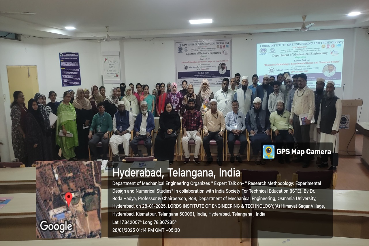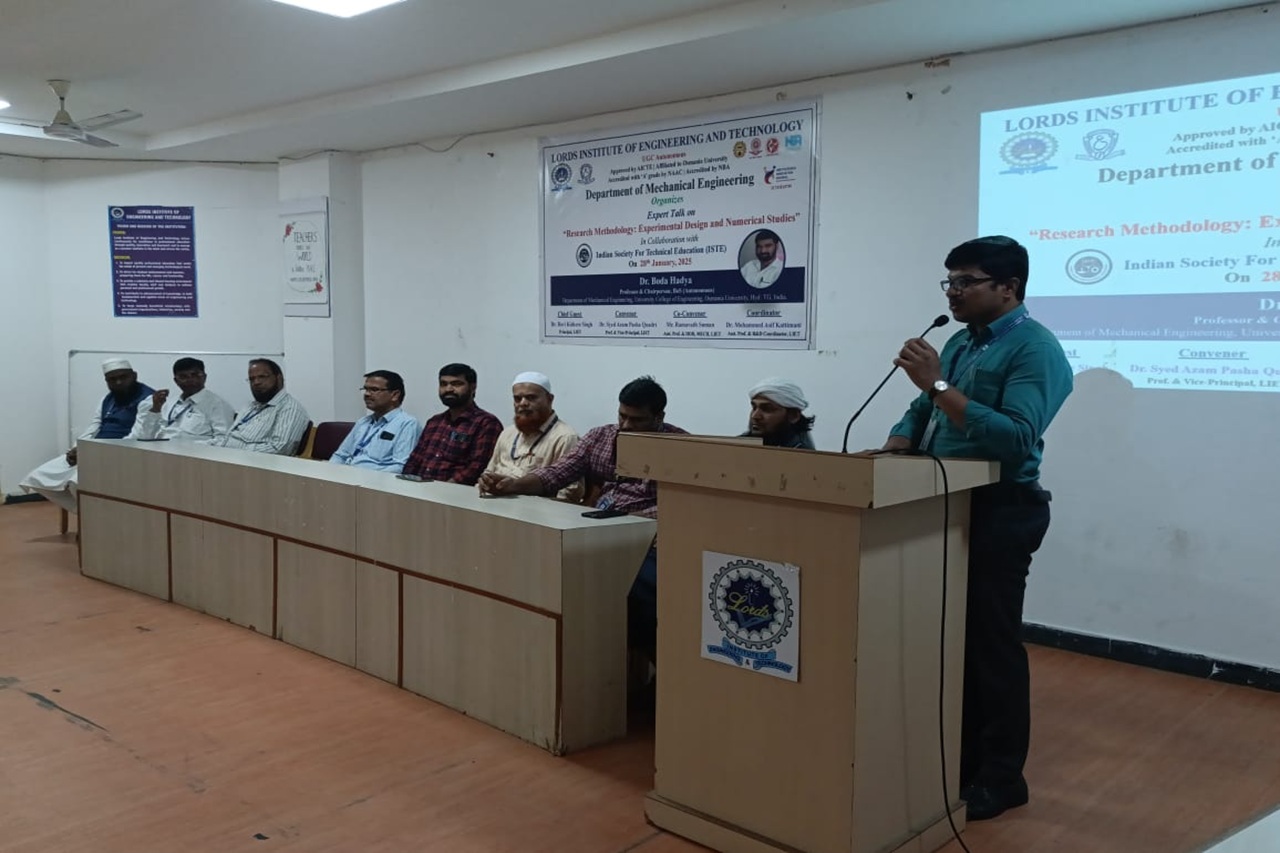 Description: Department of Mechanical Engineering has organised an Expert talk on “Research Methodology: Experimental Design and Numerical Studies” on 28-01-2025 from 10 am to 01:30 pm At Lords institute of Engineering and Technology (A),Himayath Sagar, Hyderabad and a total of 90 faculties have attended the program and enriched their knowledge in Research Methodology.
