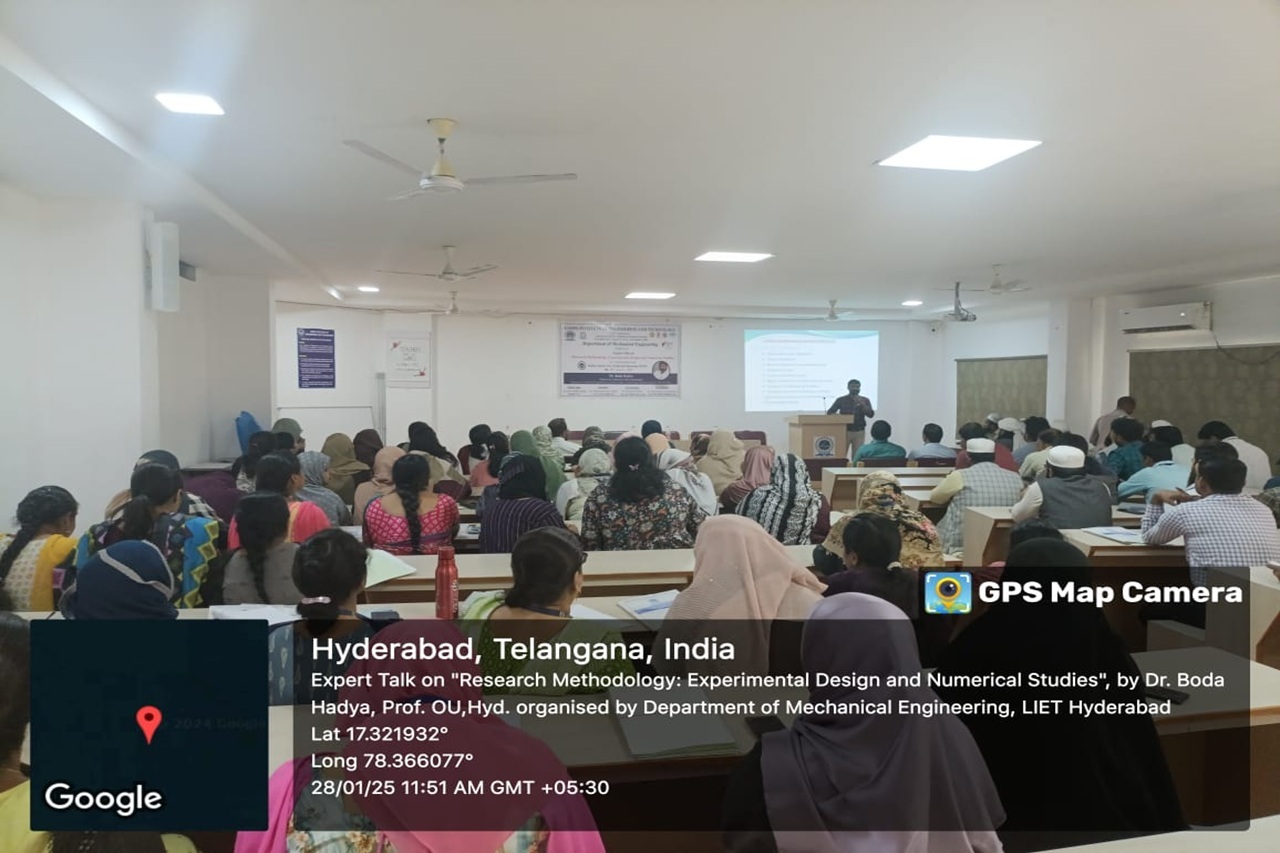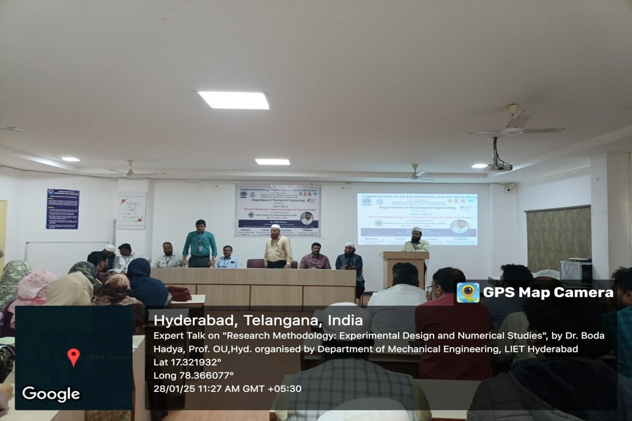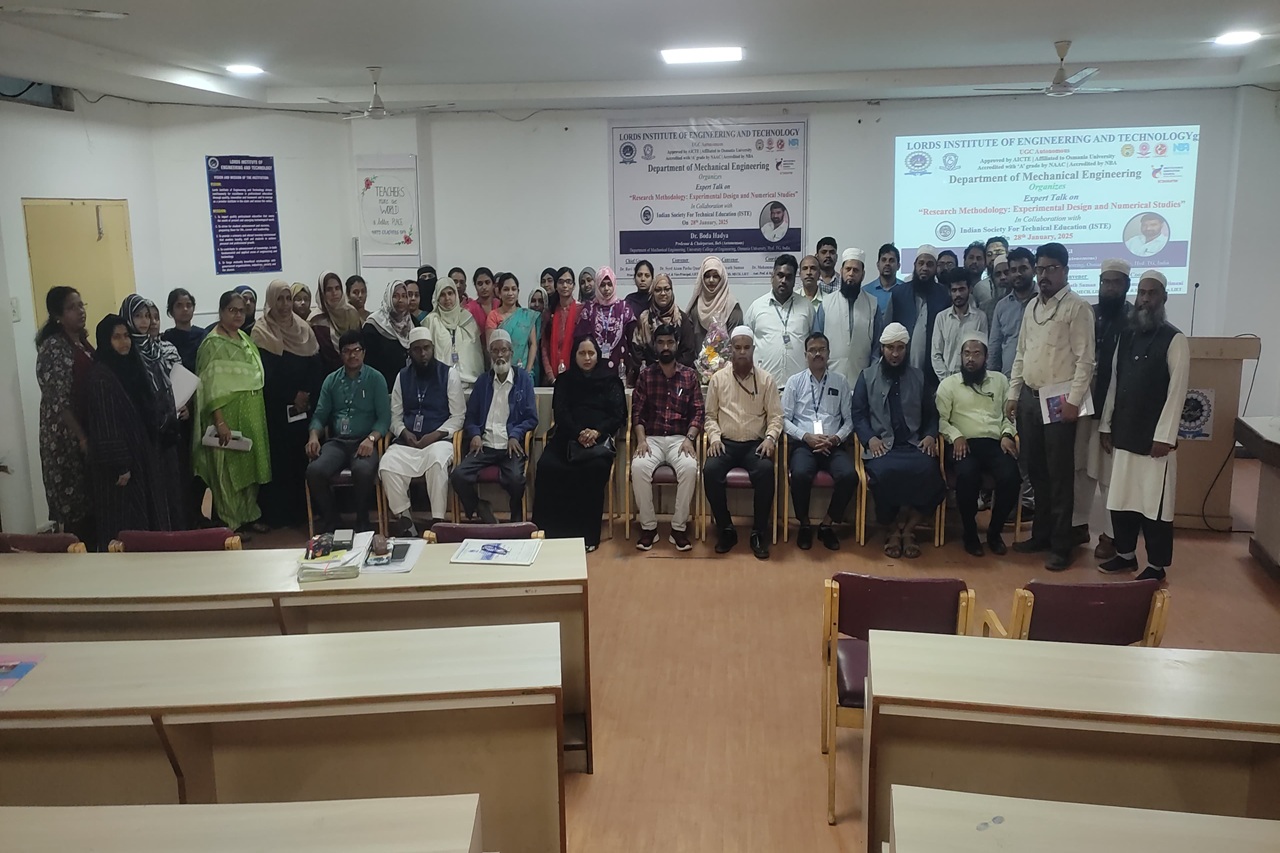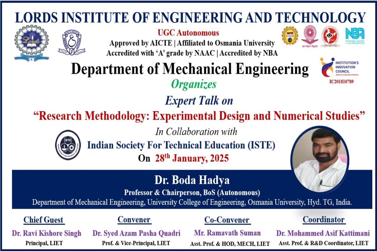 Description: Department of Mechanical Engineering has organised an Expert talk on “Research Methodology: Experimental Design and Numerical Studies” on 28-01-2025 from 10 am to 01:30 pm At Lords institute of Engineering and Technology (A),Himayath Sagar, Hyderabad and a total of 90 faculties have attended the program and enriched their knowledge in Research Methodology.
