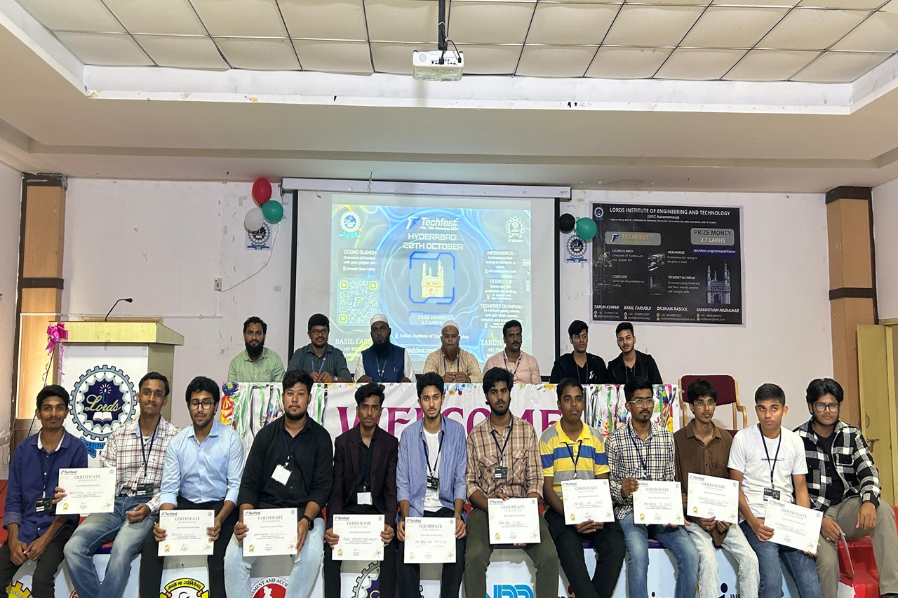 Description : Lords Institute of Engineering and Technology (A) successfully organized Tech Fest 2024, in collaboration with IIT Bombay. The event saw 280 participants from 7 states compete in four main events: Mesmerize, Codecode, Techfest Olympiad, and Cosmoclench.