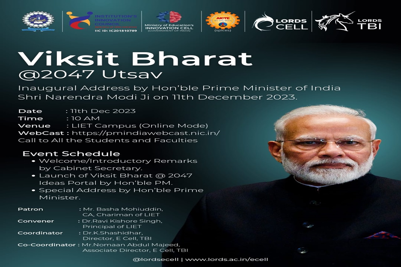 On December 11, 2023, a webcast launch event for ViksitBharat@2047 took place at the 3rd-floor seminar hall in the First Year Block of LIET. This initiative, spearheaded by Hon’ble Prime Minister Shri Narendra Modi, aims to transform our nation into a developed country by 2047. During the event, the Prime Minister inspired the youth, emphasizing their pivotal role in India’s transition from a developing to a developed nation. All first-year B.E. students attended the webcast launch of ViksitBharat@2047, followed by a session by Prof. Nomaan Abdul Majeed, Associate Director of TBI, who delved deeper into ideation. Students are required to provide their feedback on the launch between December 11th and December 25th, 2023.