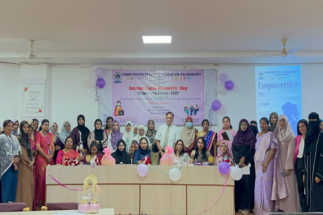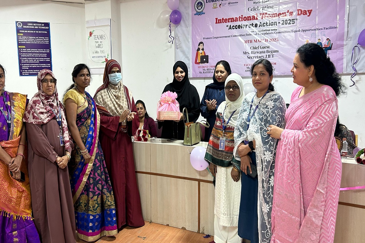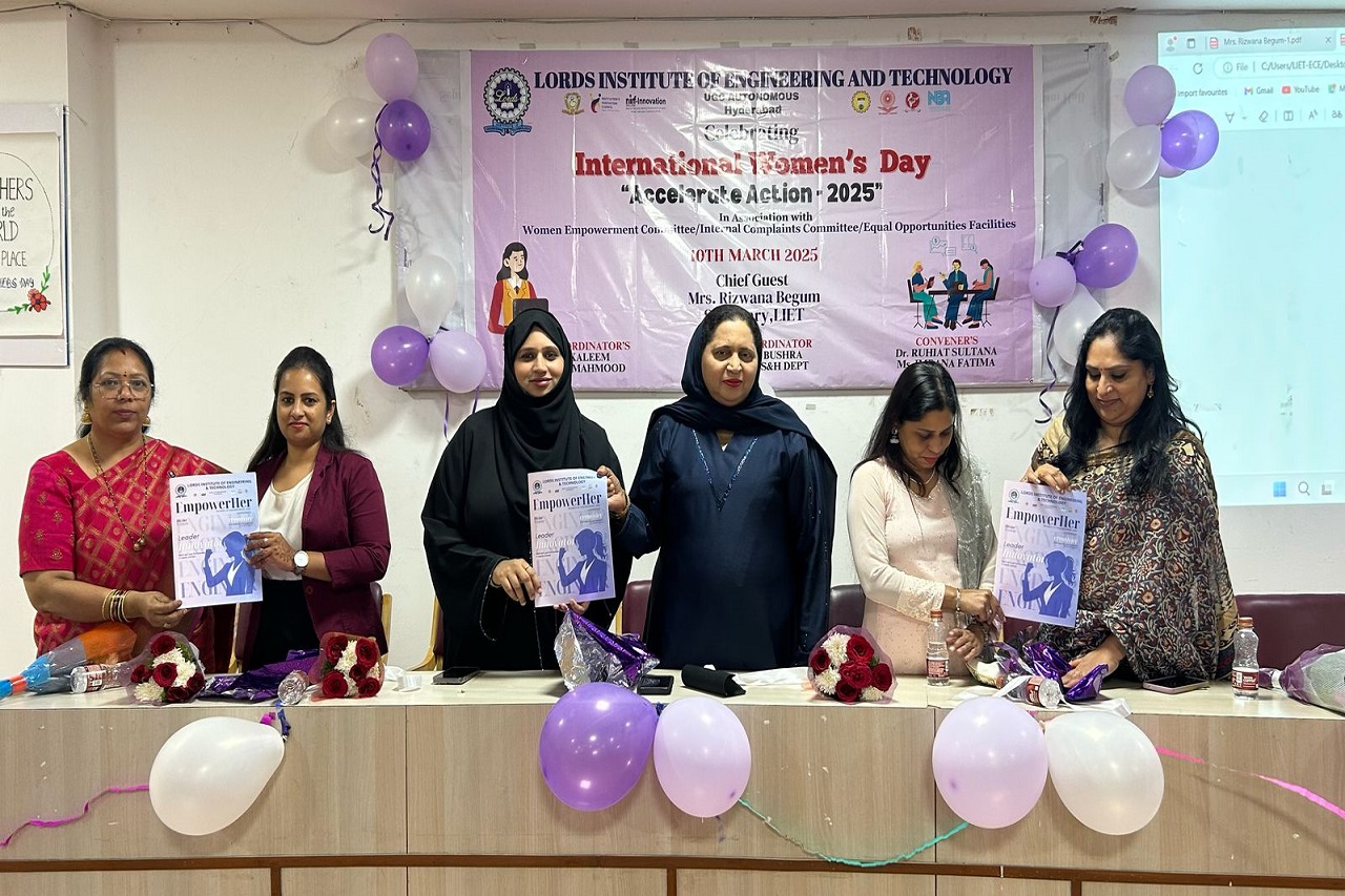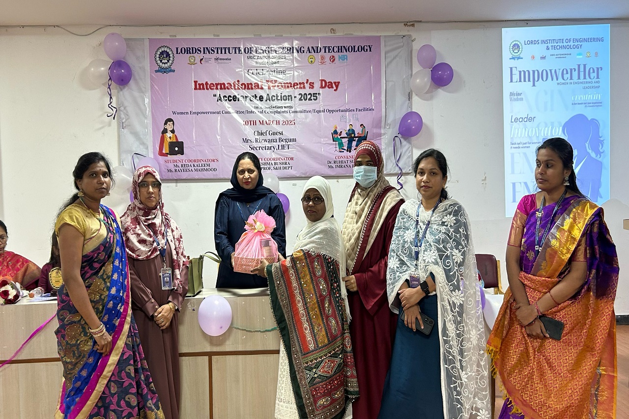 Description: Lords Institute of Engineering and Technology (A) celebrated International Women’s Day 2025 with great enthusiasm on 10th March 2025. The event was graced by our Chief Guest, Ms Rizwana Begum, Honourable Secretary, LIET, and Mrs Sana Syeeda, Additional Joint Secretary, along with a Guest of Honors were all successful women entrepreneurs. They all shared their inspiring journey, motivating our girl students to innovate and pursue entrepreneurship. As part of the Women’s Day Celebration 2025, a prize distribution ceremony was held to honour the winners of various competitions conducted for girl students. Additionally, the highlight of the event was the launch of the Women’s Magazine, showcasing the achievements, stories, and contributions of women in our institution, inspiring future generations.