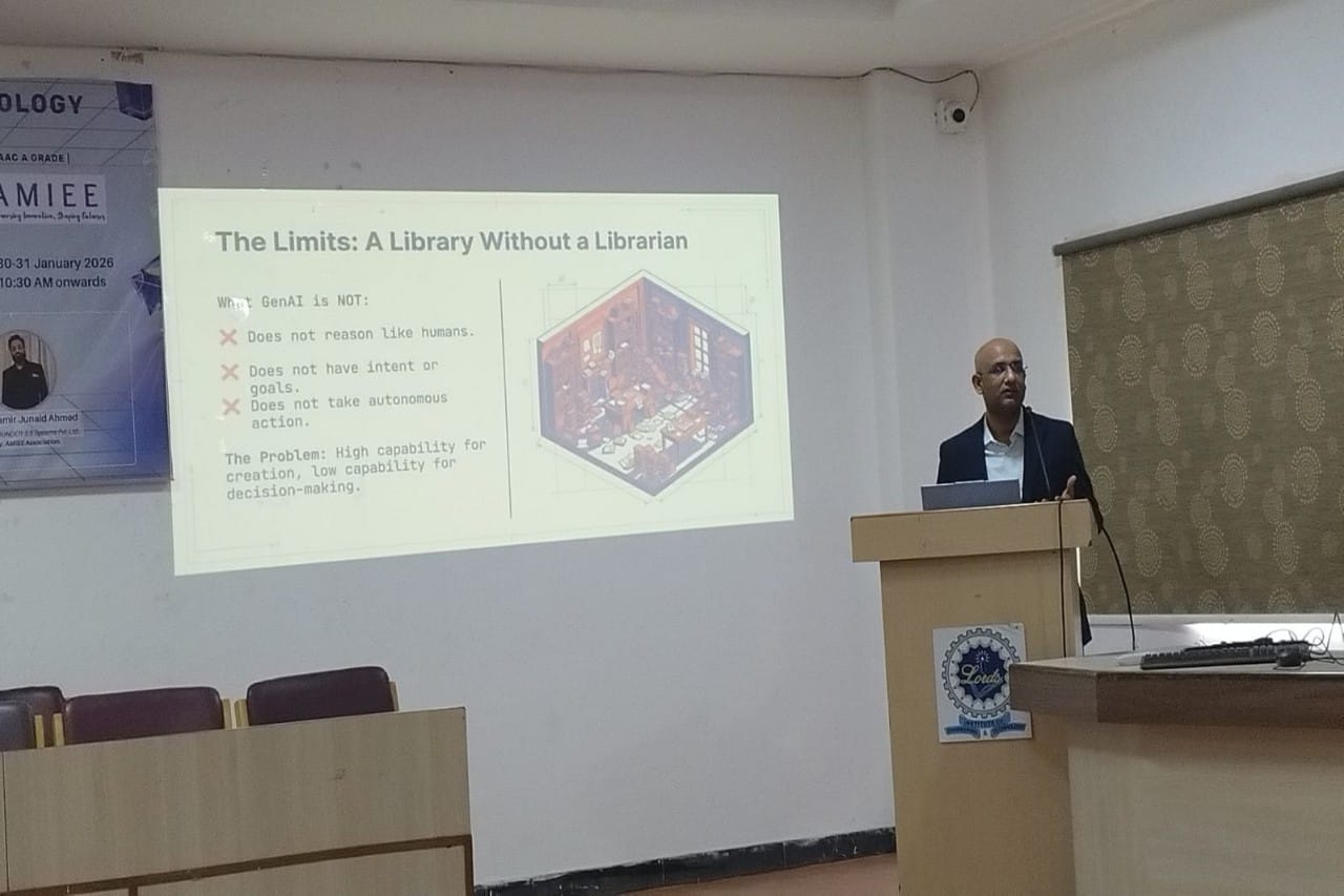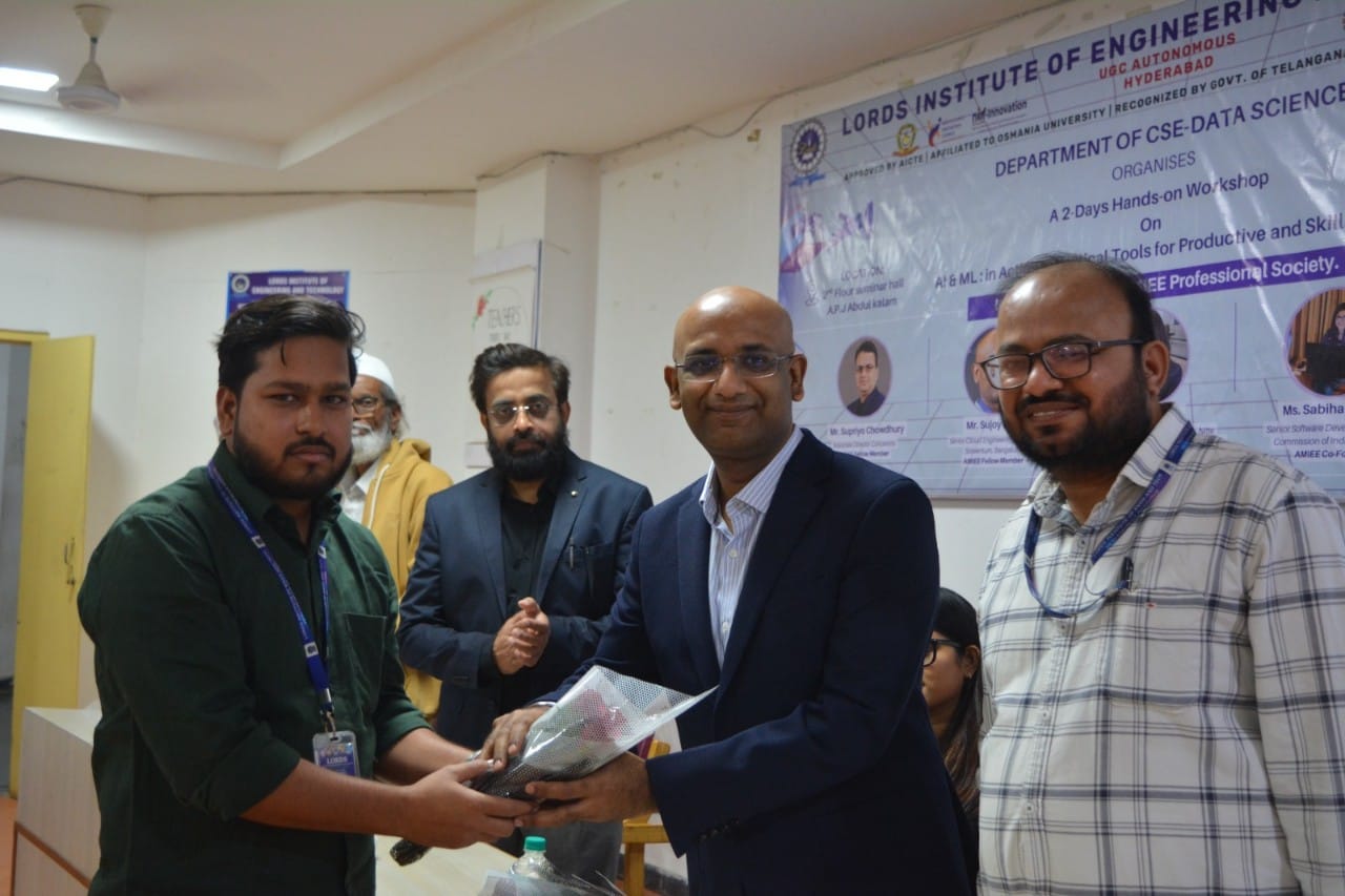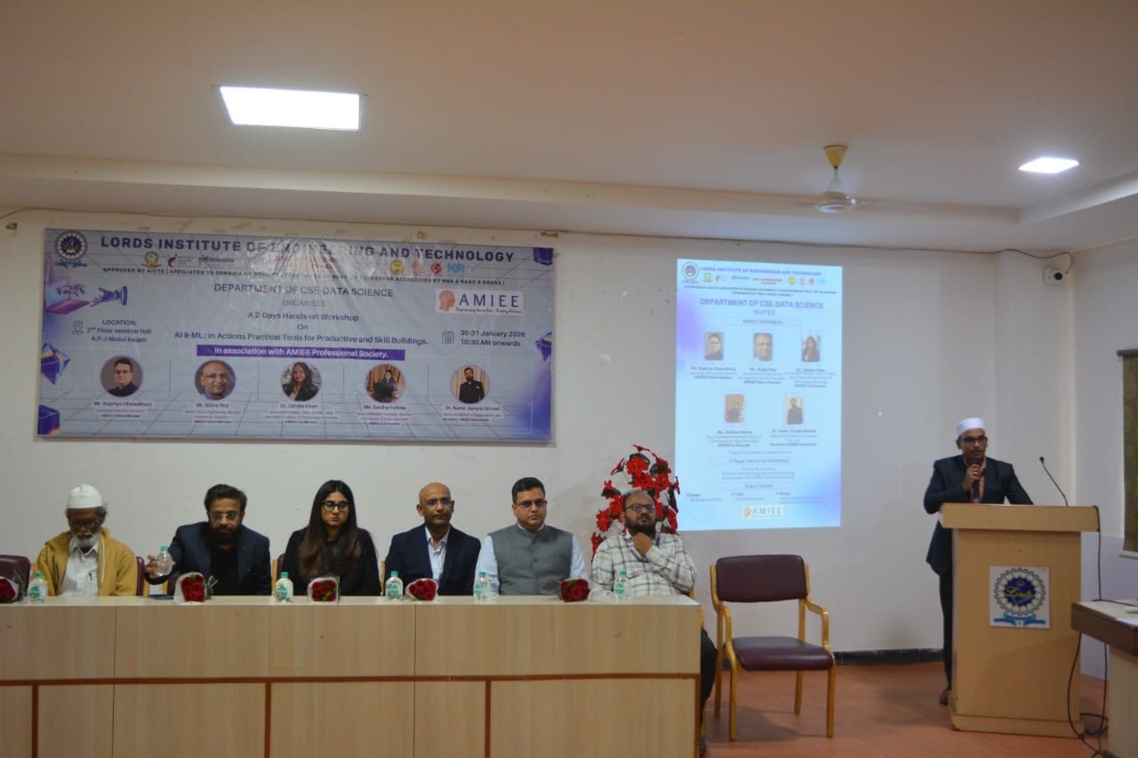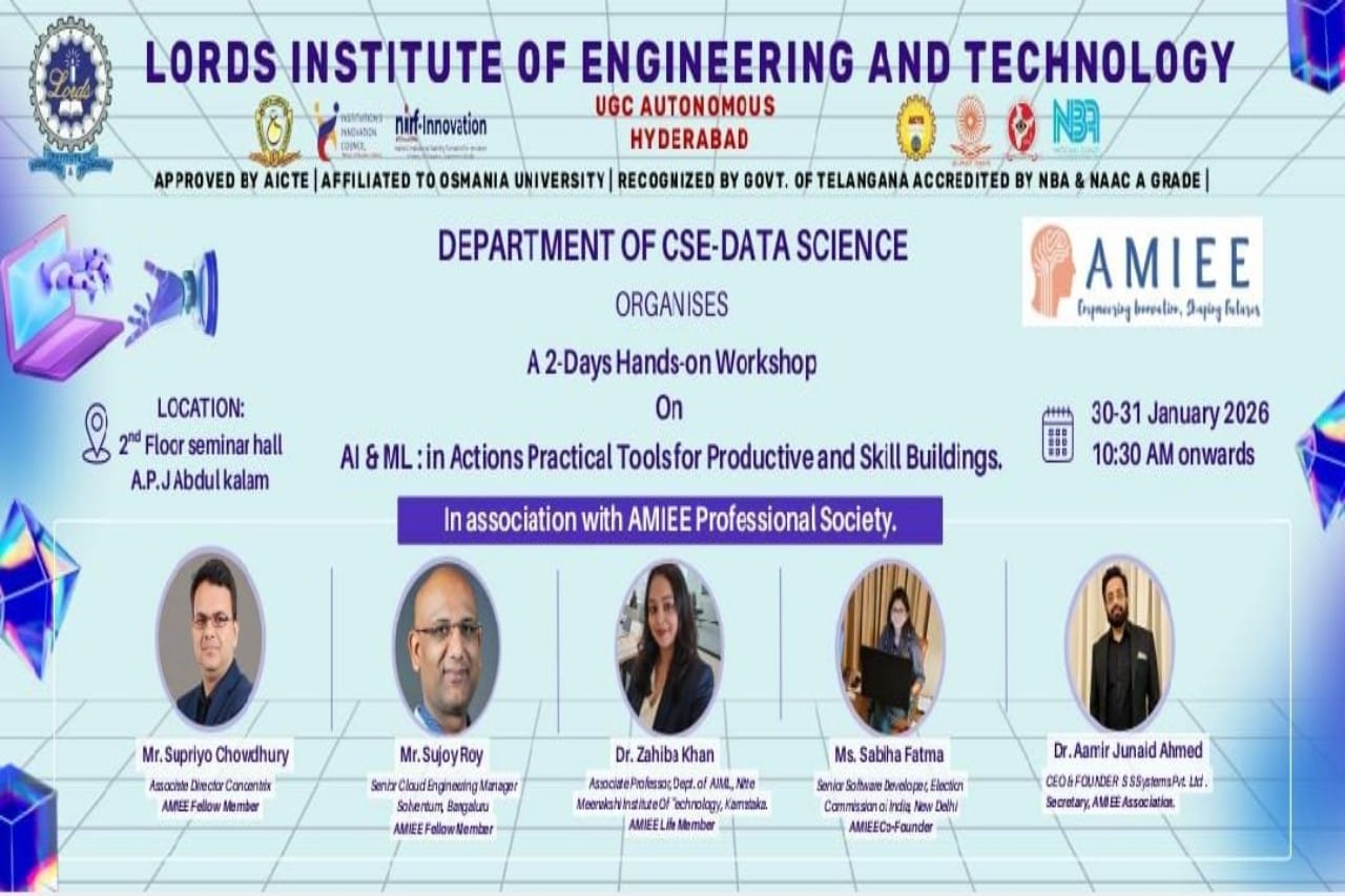 Description: The Department of CSE – Data Science is organized a 2-Days Hands-on Workshop on “AI & ML in Actions: Practical Tools for Productive and Skill Buildings”, in association with the AMIEE Professional Society, on 30th and 31st January 2026 at the 2nd Floor Seminar Hall, A. P. J. Abdul Kalam Block, LIET. The workshop aims to provide practical exposure to Artificial Intelligence and Machine Learning tools through hands-on sessions. The program focused on enhancing participants’ technical competencies, improving problem-solving abilities, and building industry-relevant skills by applying AI and ML concepts in real-time scenarios.