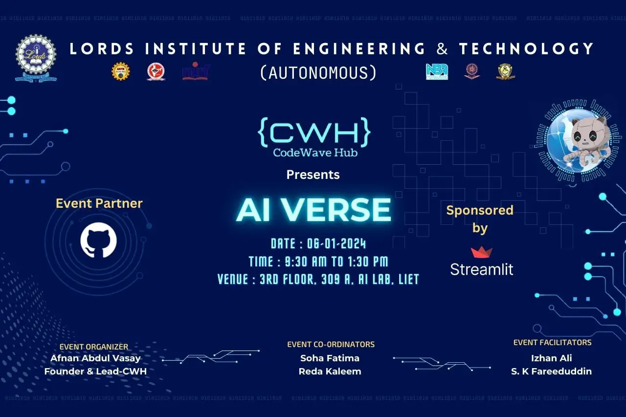 Description about the event (50 Words): CodeWave Hub at Lords Institute of Engineering and Technology (A) conducted “AI Verse”, an dynamic event featuring a hands-on workshop on January 6, 2024. Engaged and covered essential topics such as Language Model (LLM), Machine Learning for Web (ML for Web), MLOps, and Streamlit.
