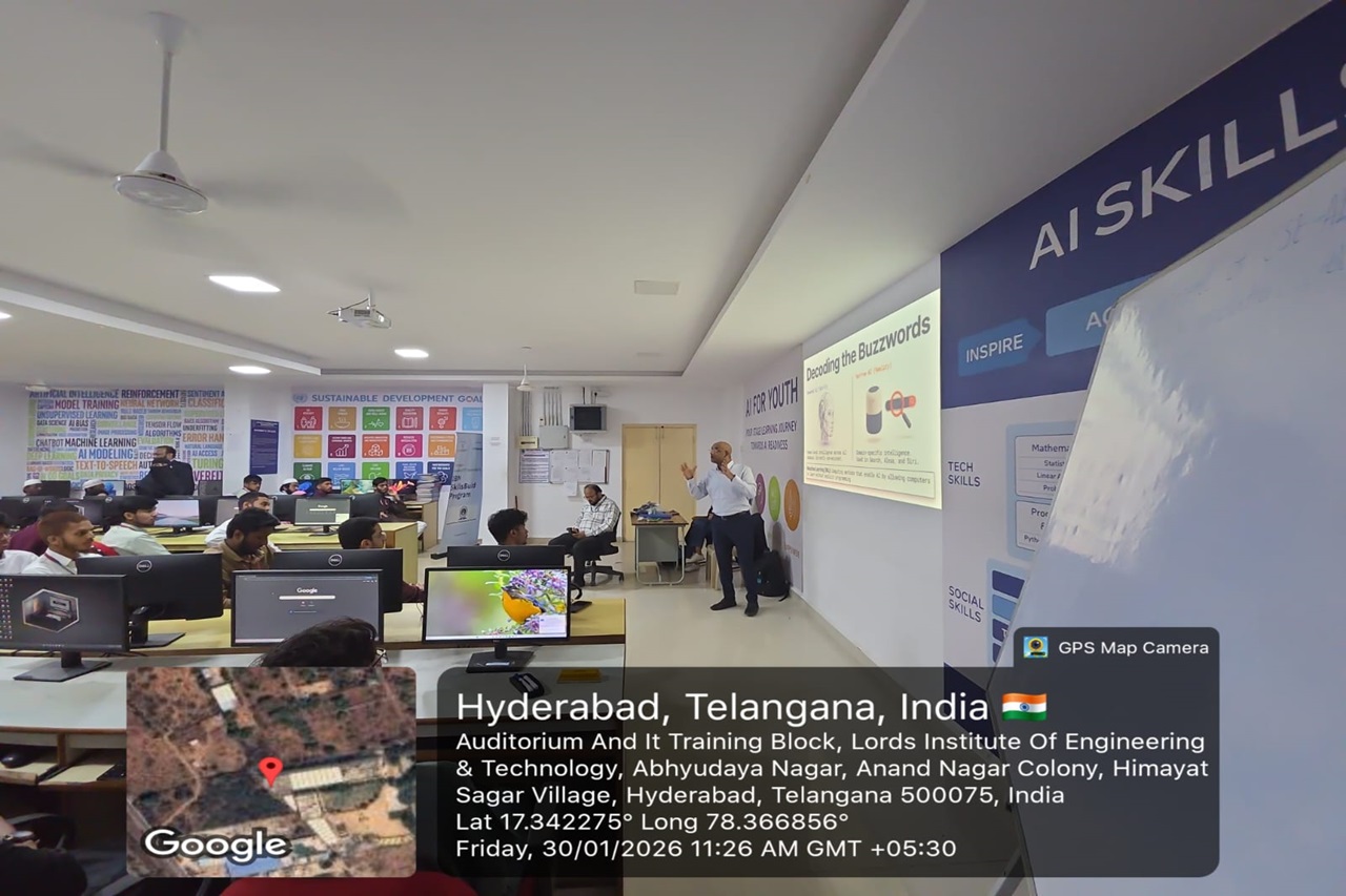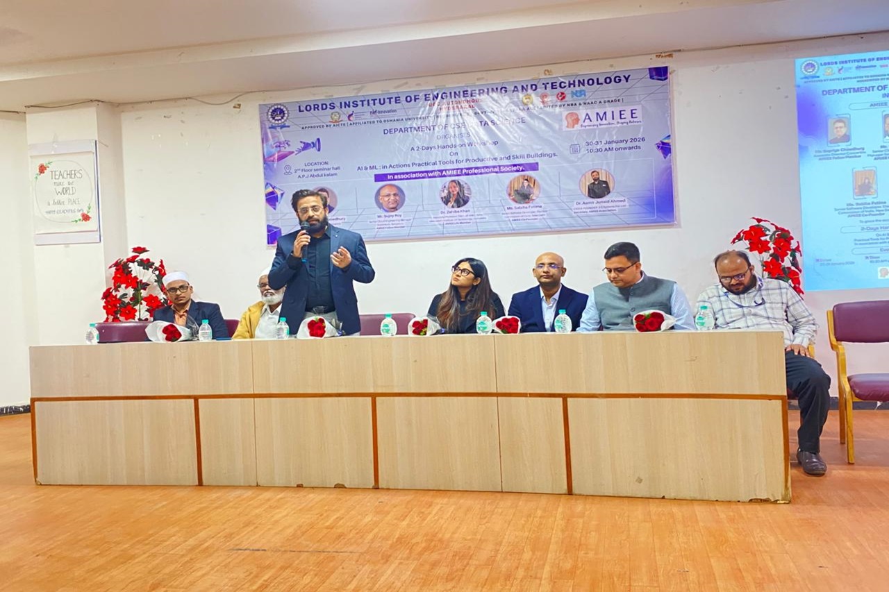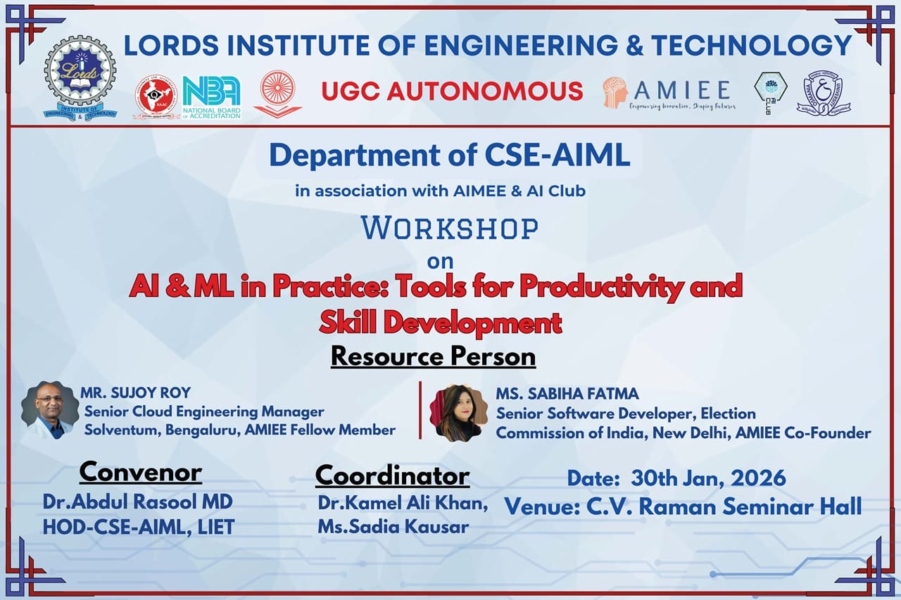 Description: The Department of CSE–AIML at LORDS Institute of Engineering and Technology organized workshop on the practical applications of Artificial Intelligence and Machine Learning. The workshop aimed to enhance students’ productivity and skill development through exposure to real-world AI and ML tools and use cases. The resource persons shared valuable industry insights, hands-on methodologies, and best practices, enabling participants to effectively bridge the gap between theoretical knowledge and practical implementation. The interactive sessions motivated students to develop future-ready skills aligned with contemporary industry demands.