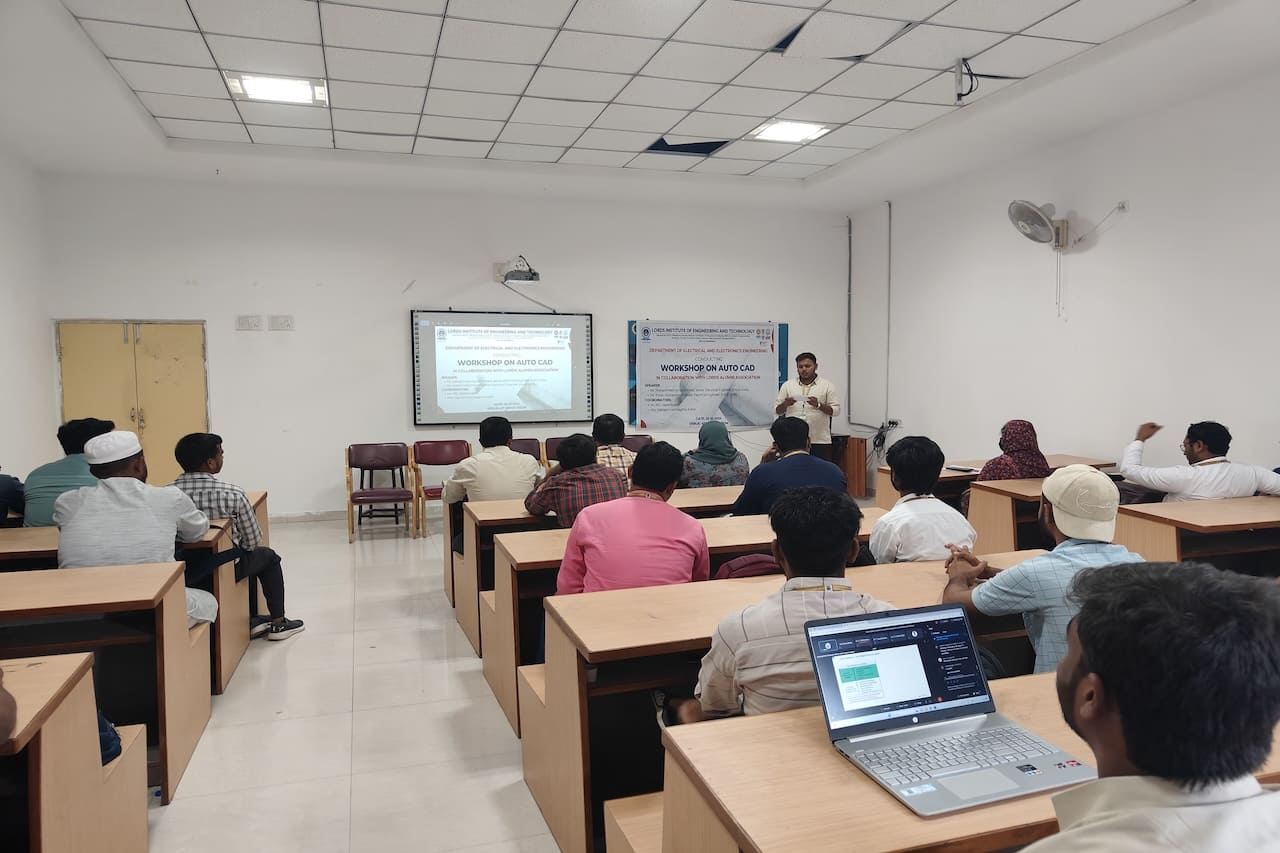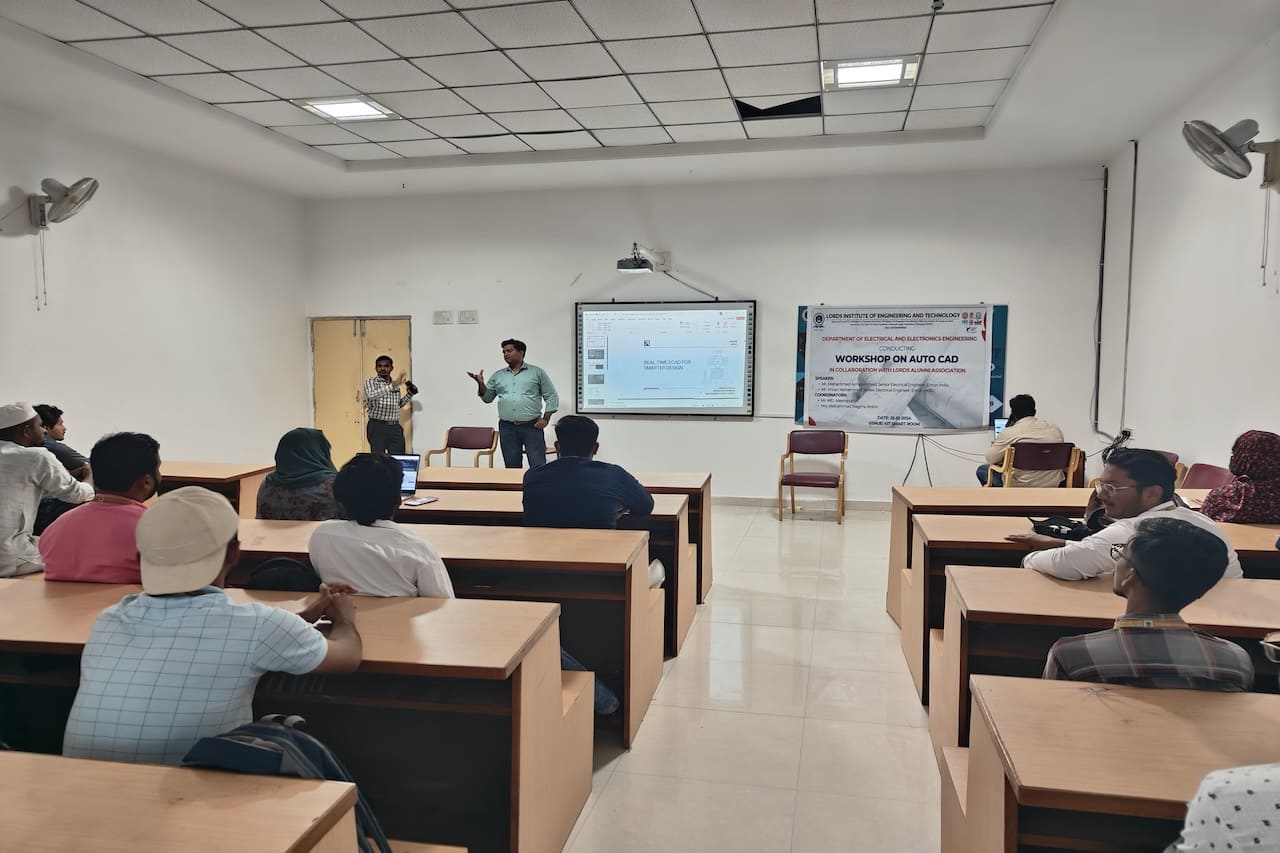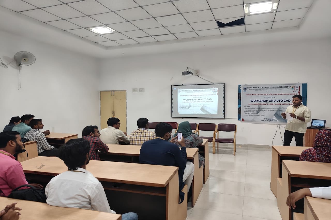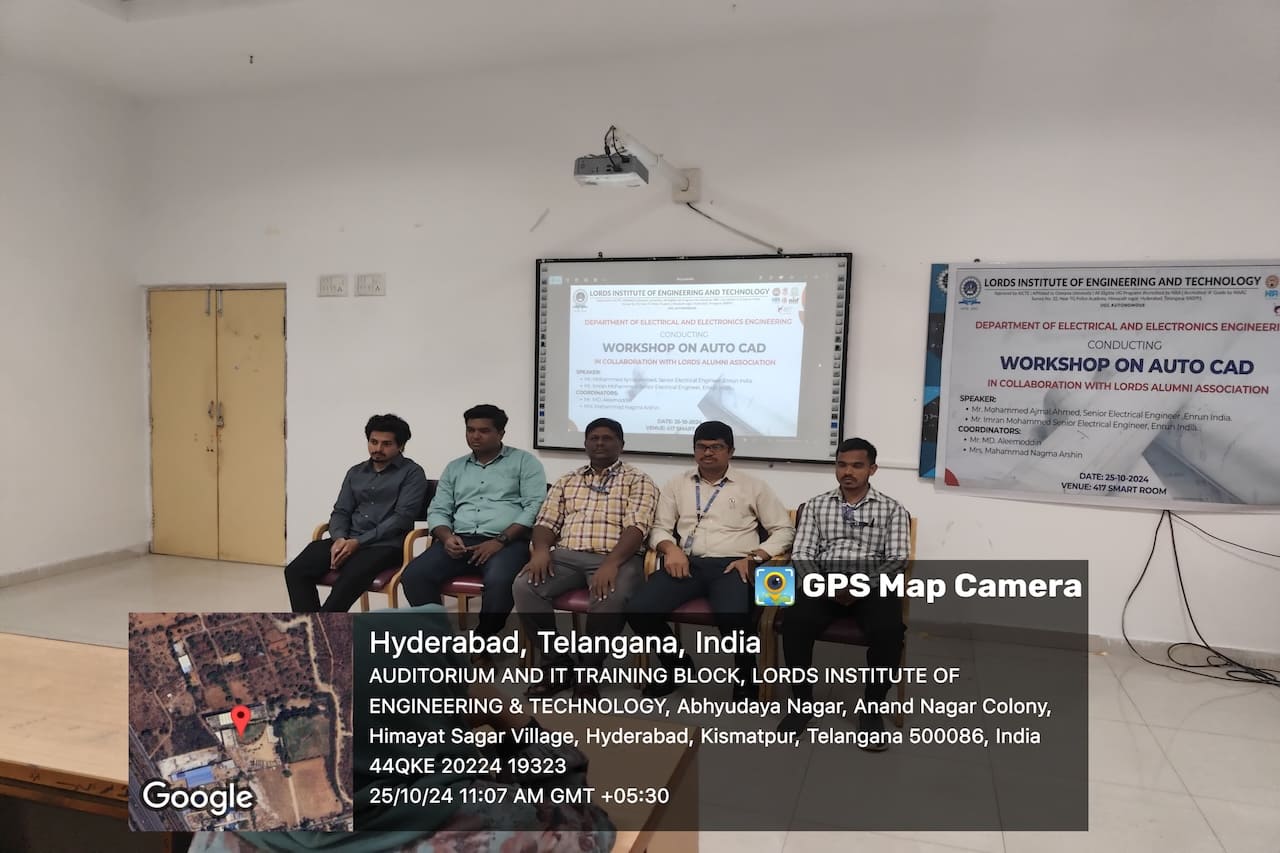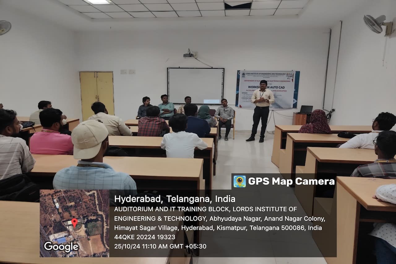 Description: The Department of Electrical and Electronics Engineering at Lords Institute of Engineering and Technology (A) hosted an insightful workshop on “AutoCAD” on Friday, October 25, 2024. This session was led by distinguished alumni Mr. Mohammed Ajmal Ahmed and Mr. Imran Ahmed, both Senior Electrical Engineers at Enrun India in Hyderabad. Through their expert guidance, students gained essential AutoCAD skills, participating in hands-on exercises that bridged theoretical knowledge with practical application. The workshop empowered students by enhancing their confidence, improving employability, and strengthening problem-solving abilities. This valuable experience has effectively prepared our students to meet industry standards and excel in their engineering careers.