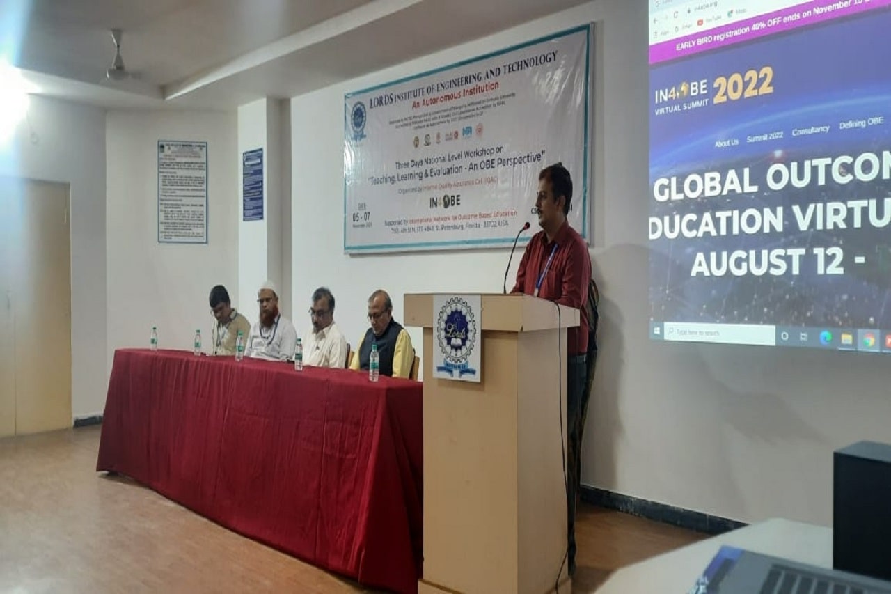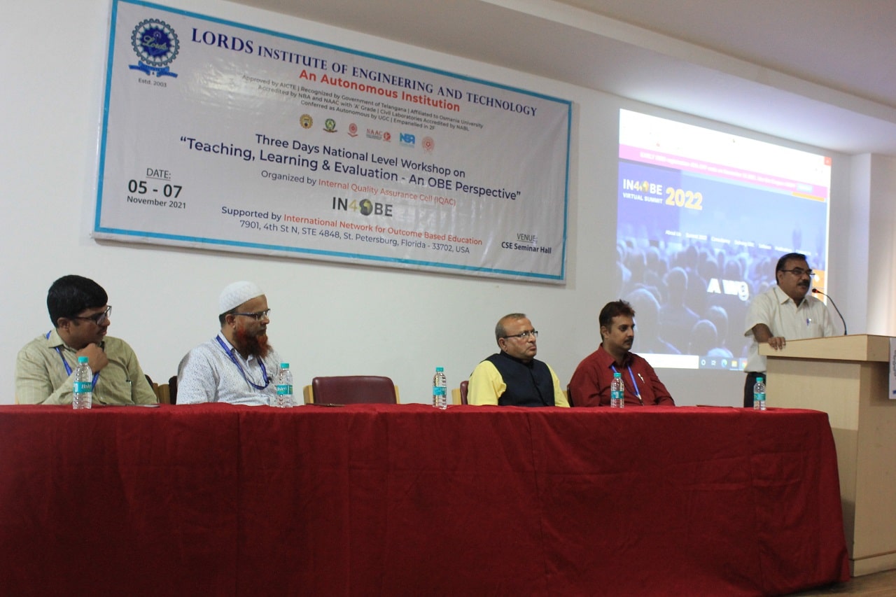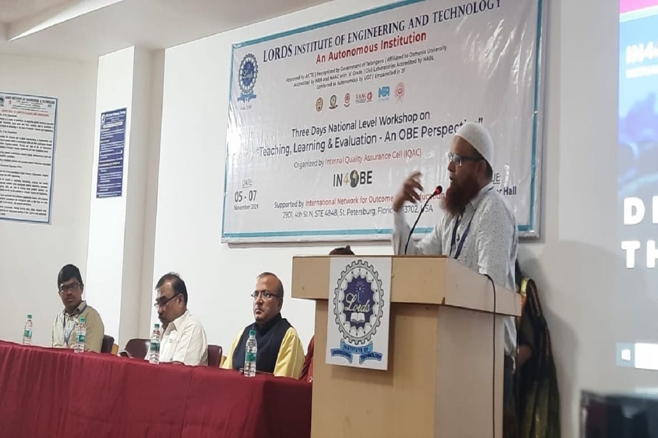 Description: Internal Quality Assurance Cell (IQAC), Lords Institute of Engineering and Technology (Autonomous), Hyderabad organized a 3-Days National Level Workshop on Teaching, Learning & Evaluation – An OBE Perspective for the faculty members of various institutions across the country on topics such as OBE in Accreditations, Bloom’s Taxonomy, CO-PO/PSO Mappings, Curriculum Gaps, Attainments, Rubrics and Automation